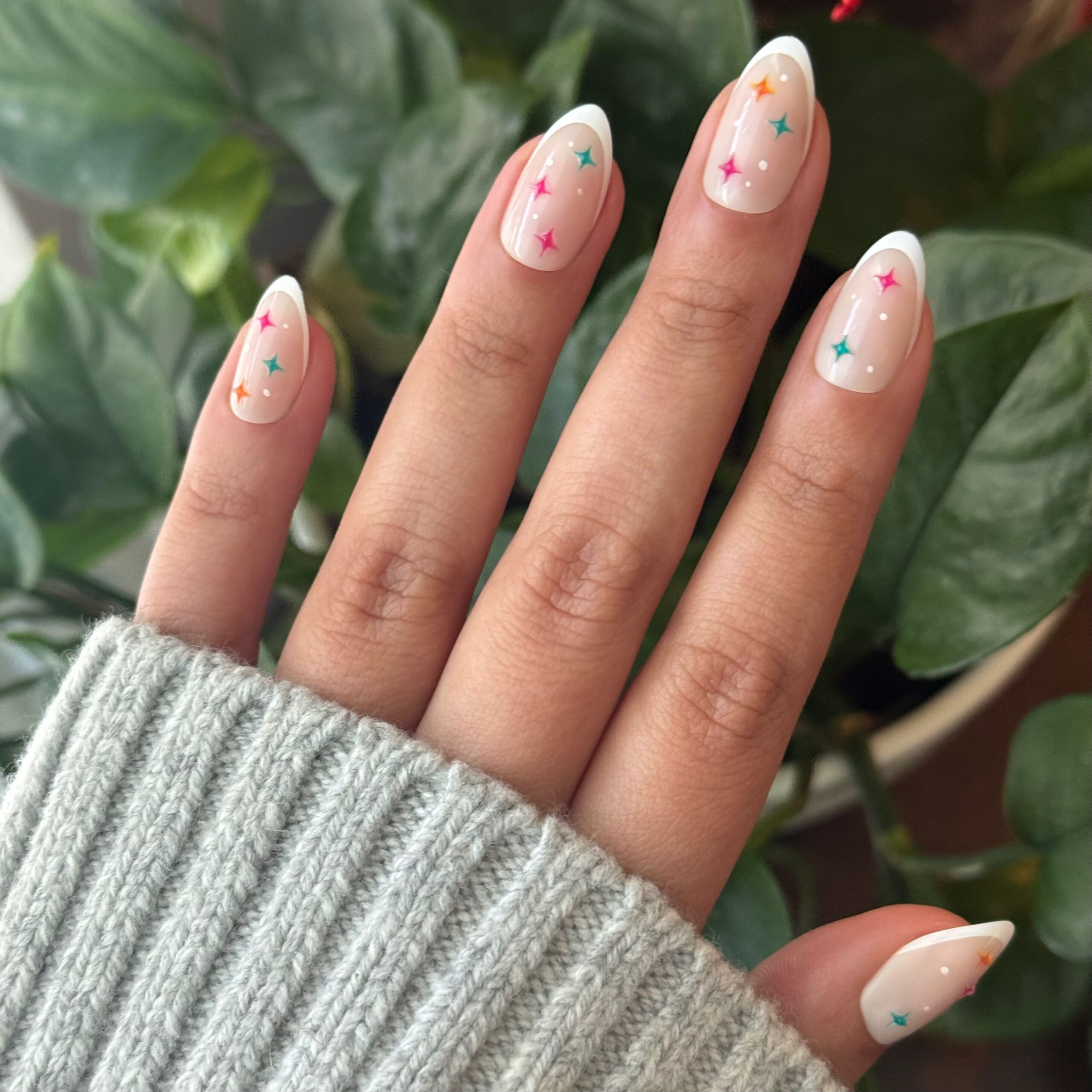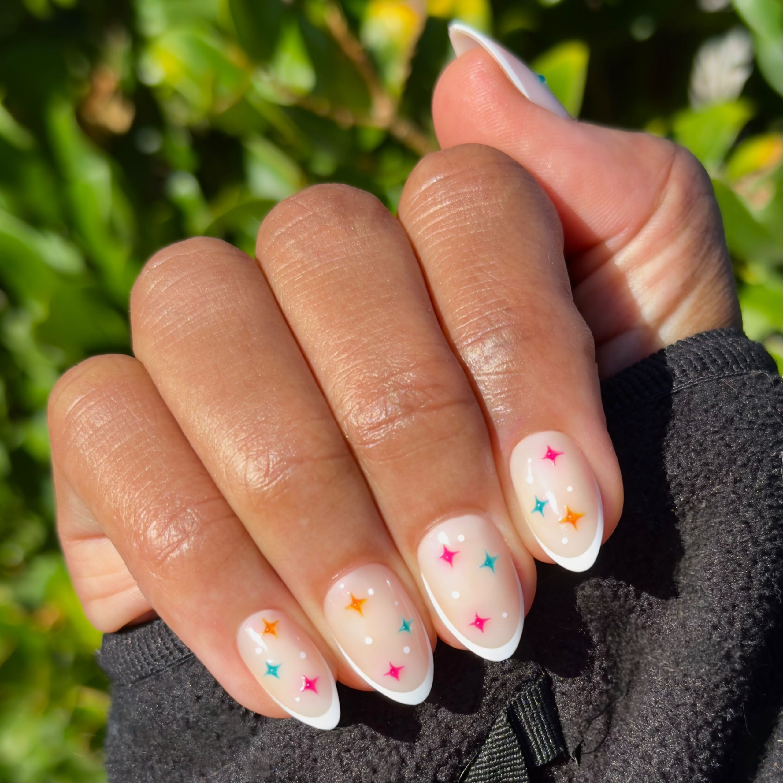 A shimmering silver french tip mani accented by puffy gemstones in a medium almond shape.