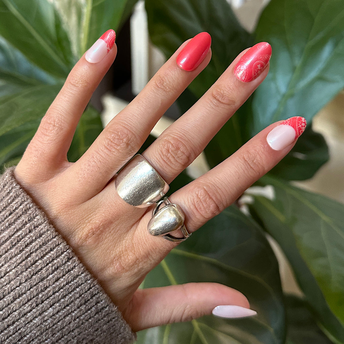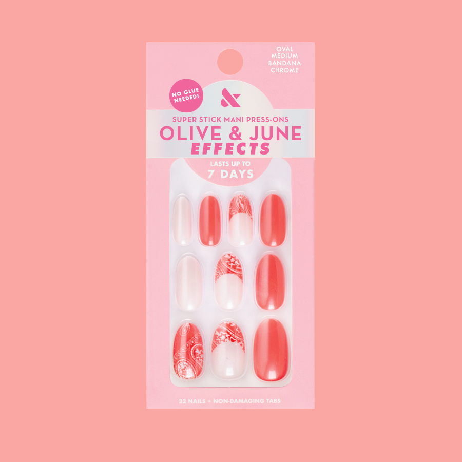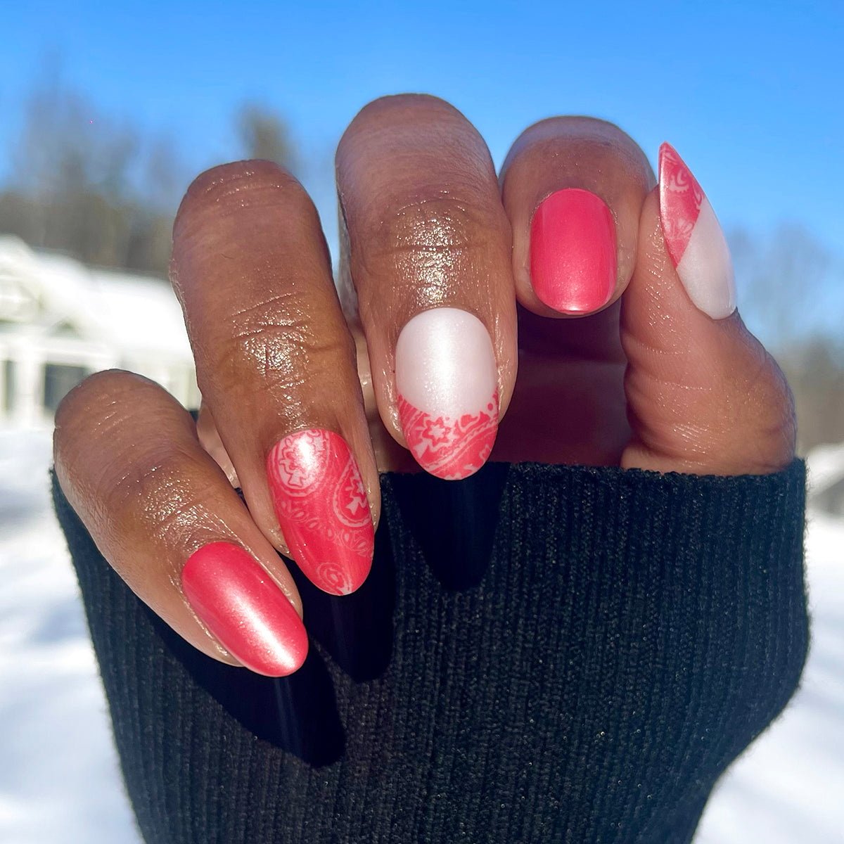 A bright bandana print mixed mani pack topped with shimmery chrome in a medium oval shape.