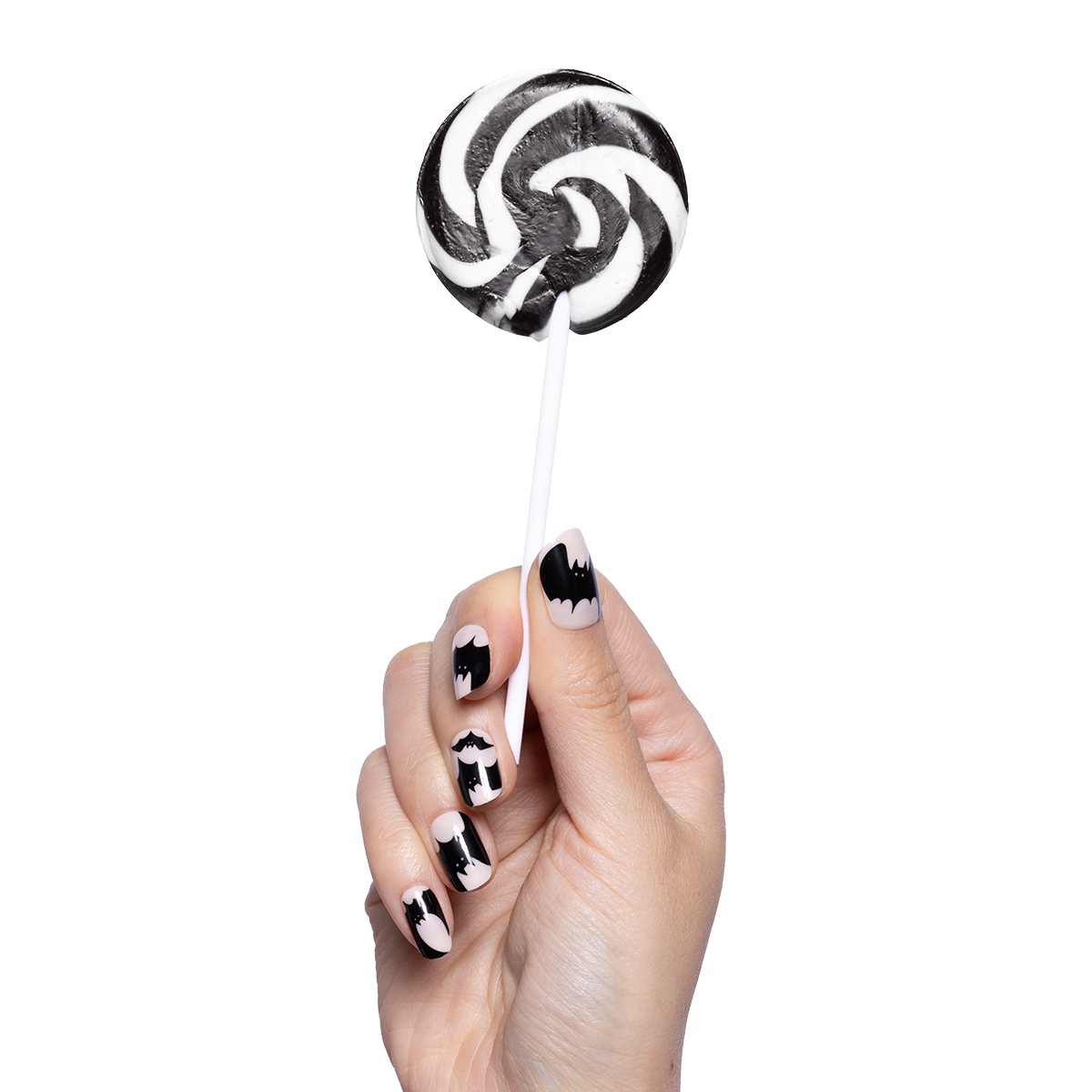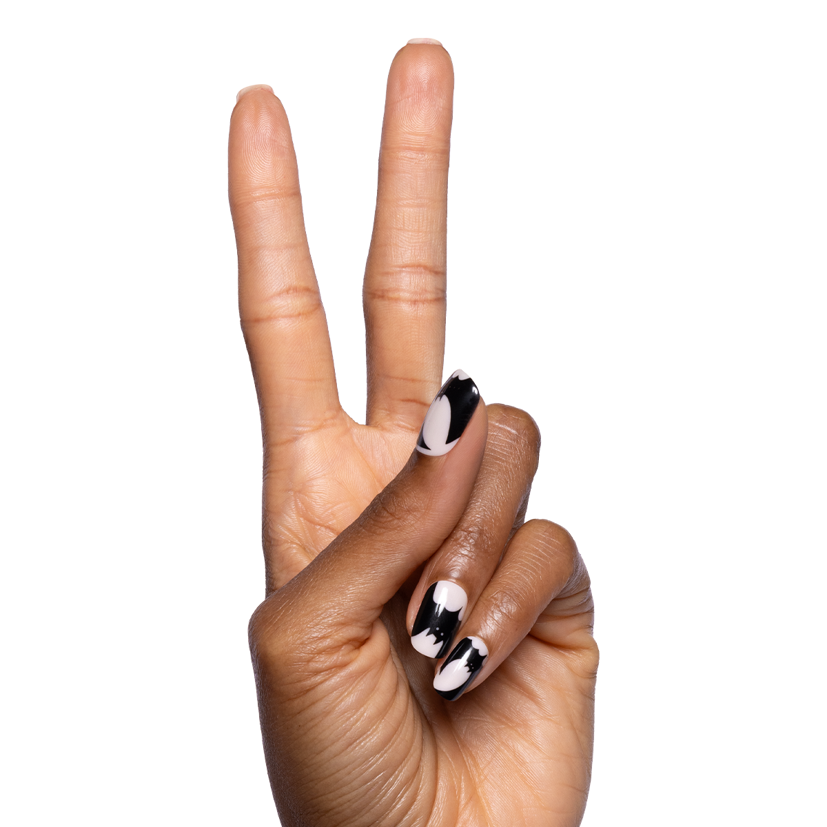 A neutral mani gets super scary with a party of bats in a short squoval shape.