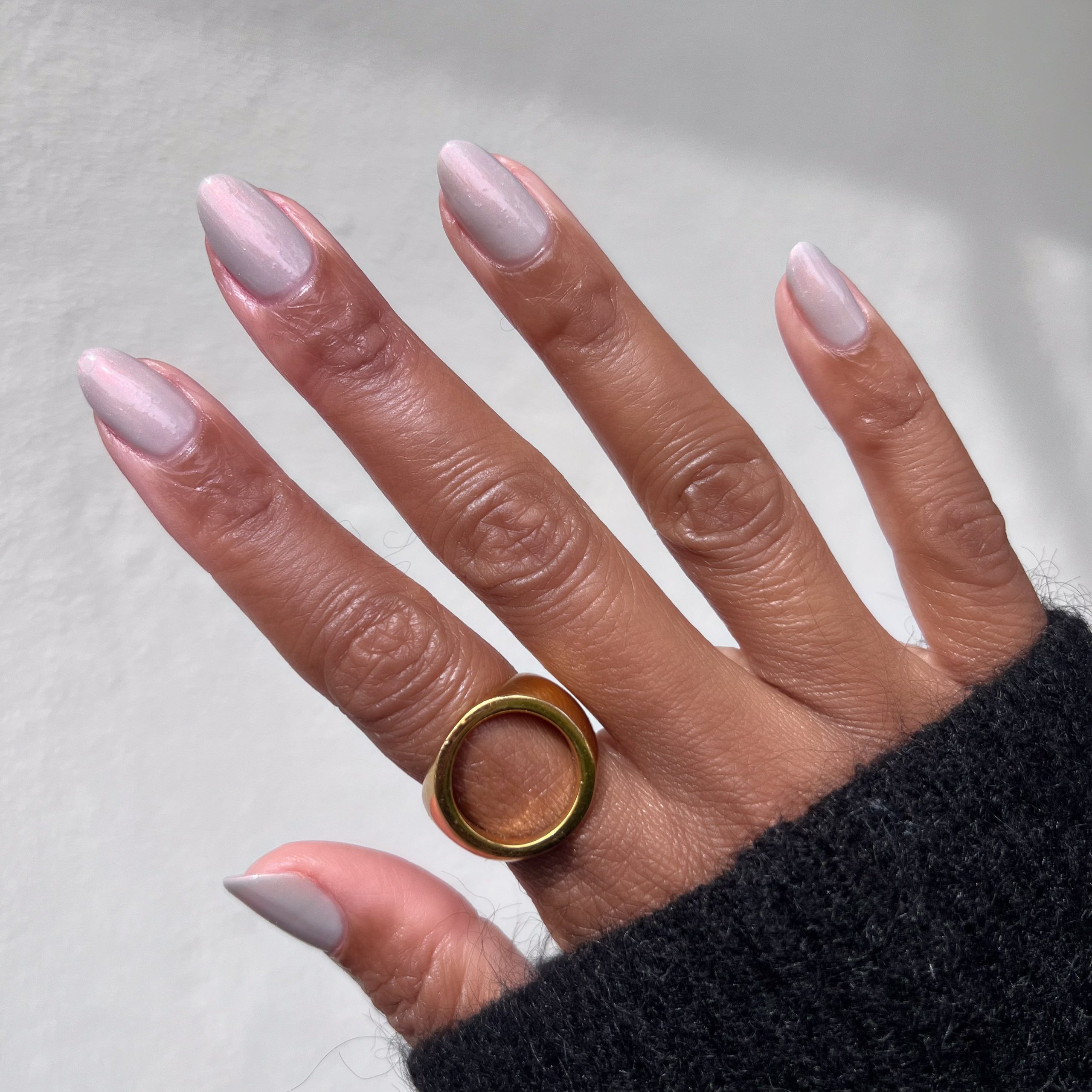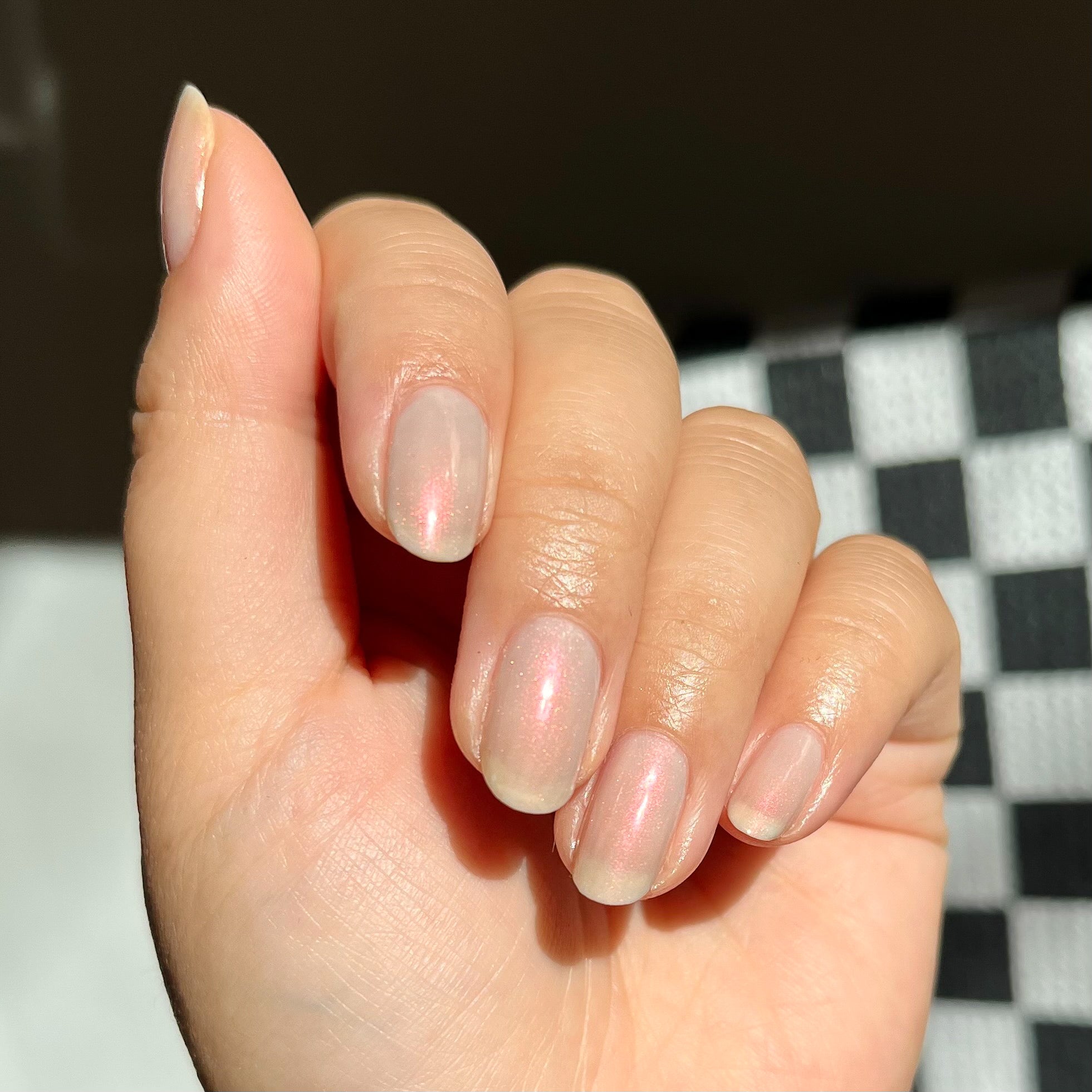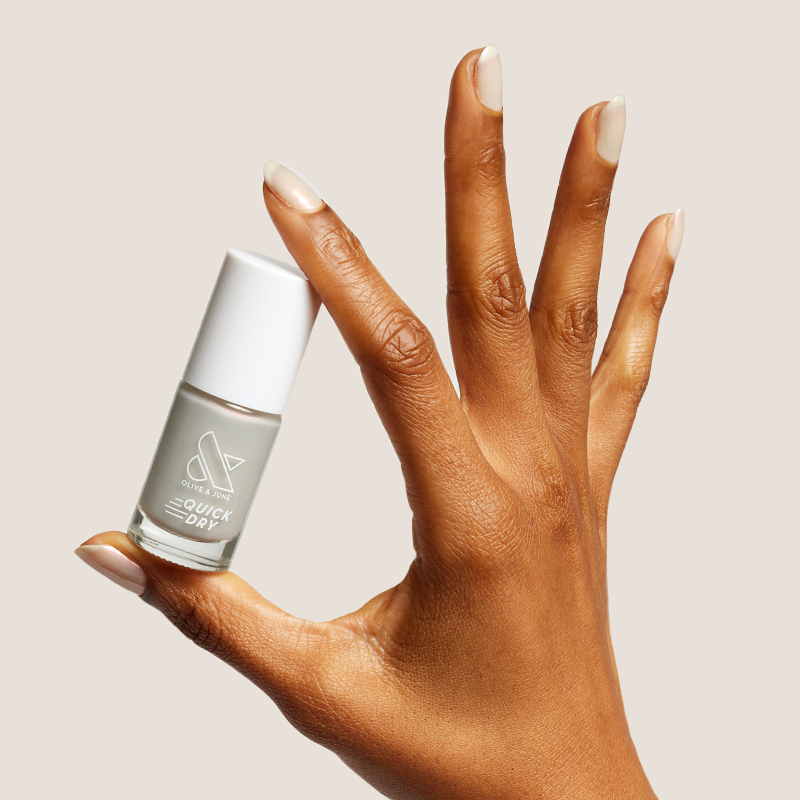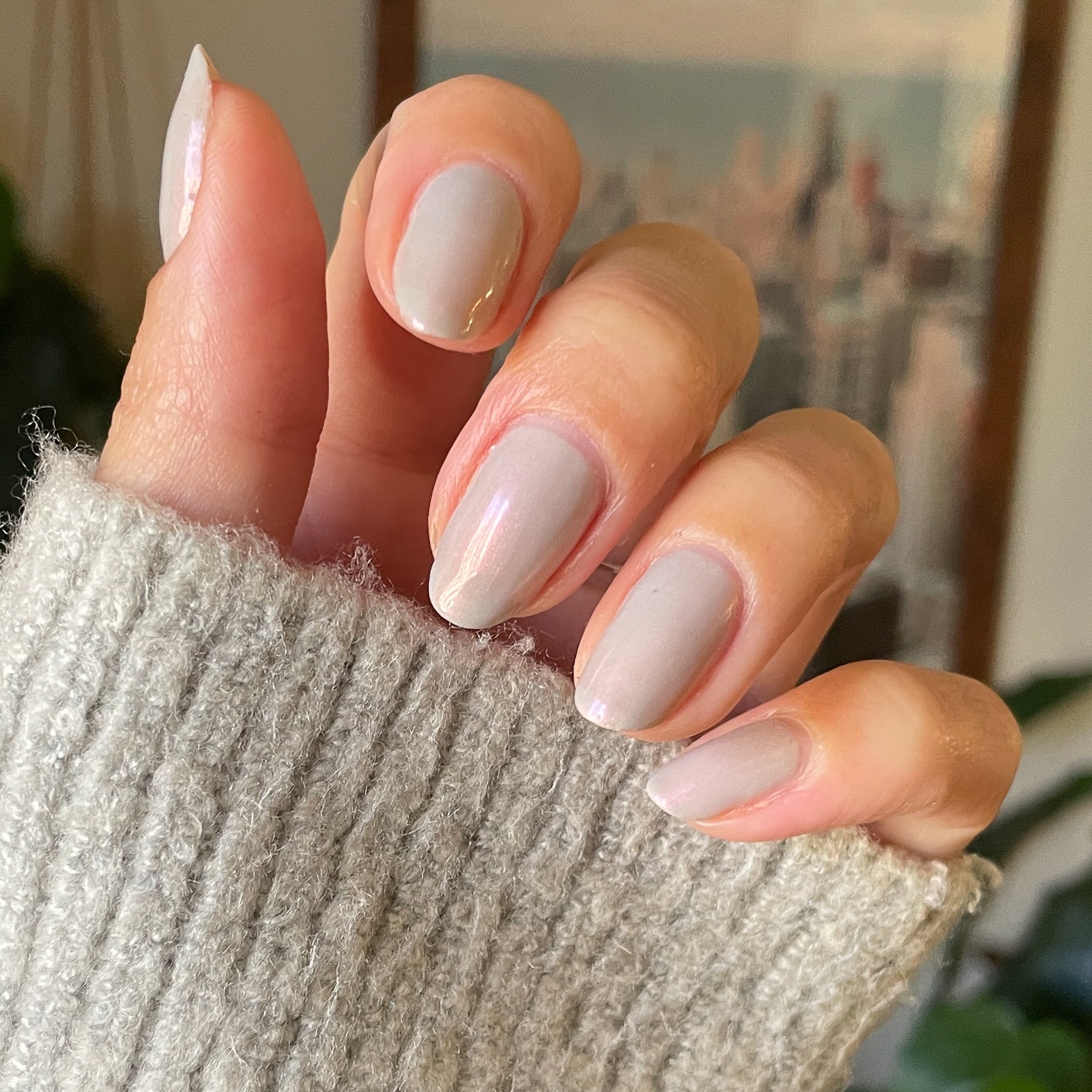 An iridescent milky grey for neutral nails that really take you places.