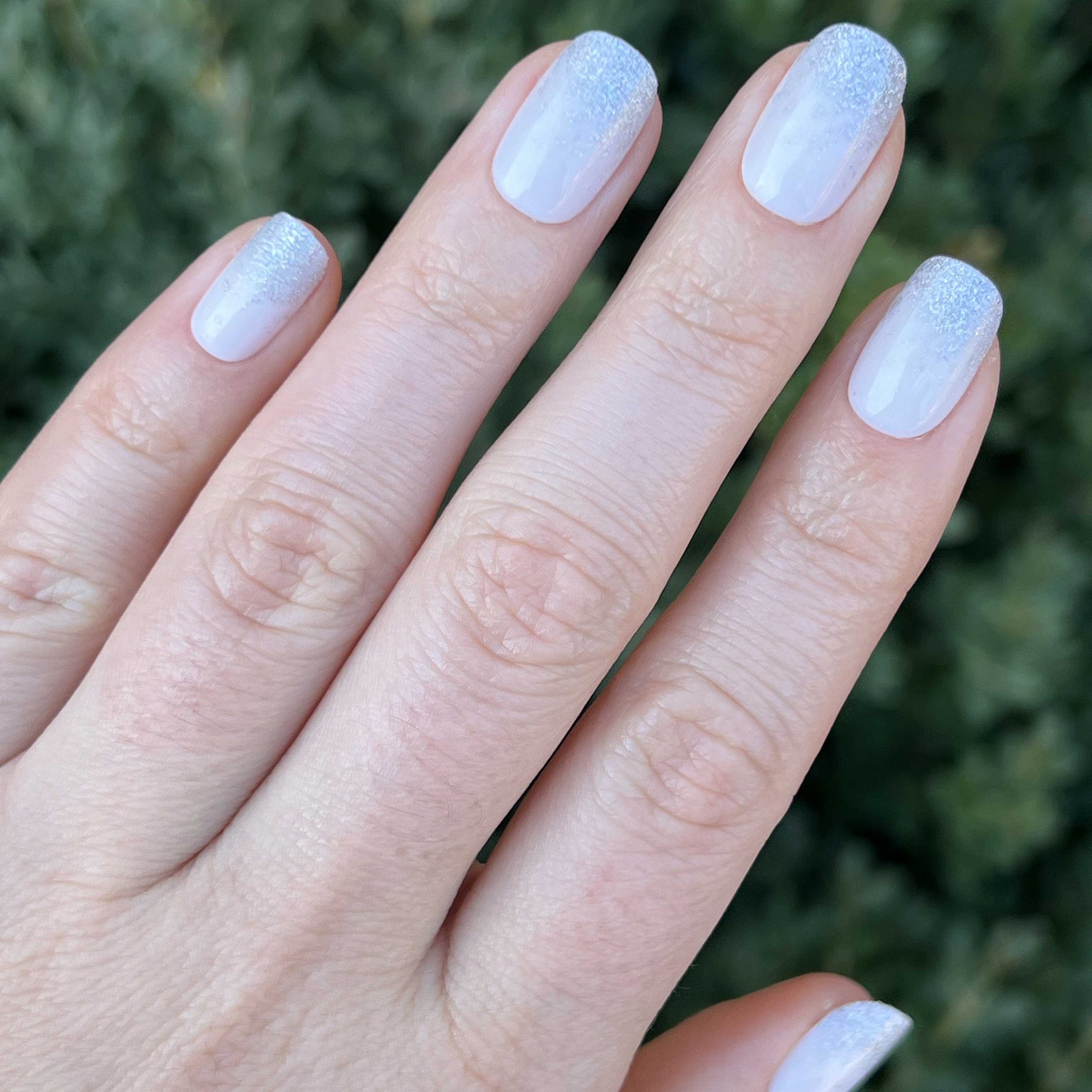 A perfect gradient of silver glitter on a neutral Bunny Slope base in a short squoval shape.