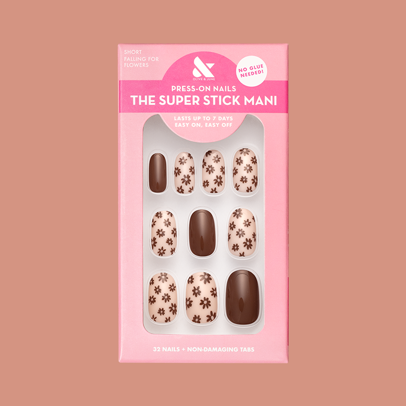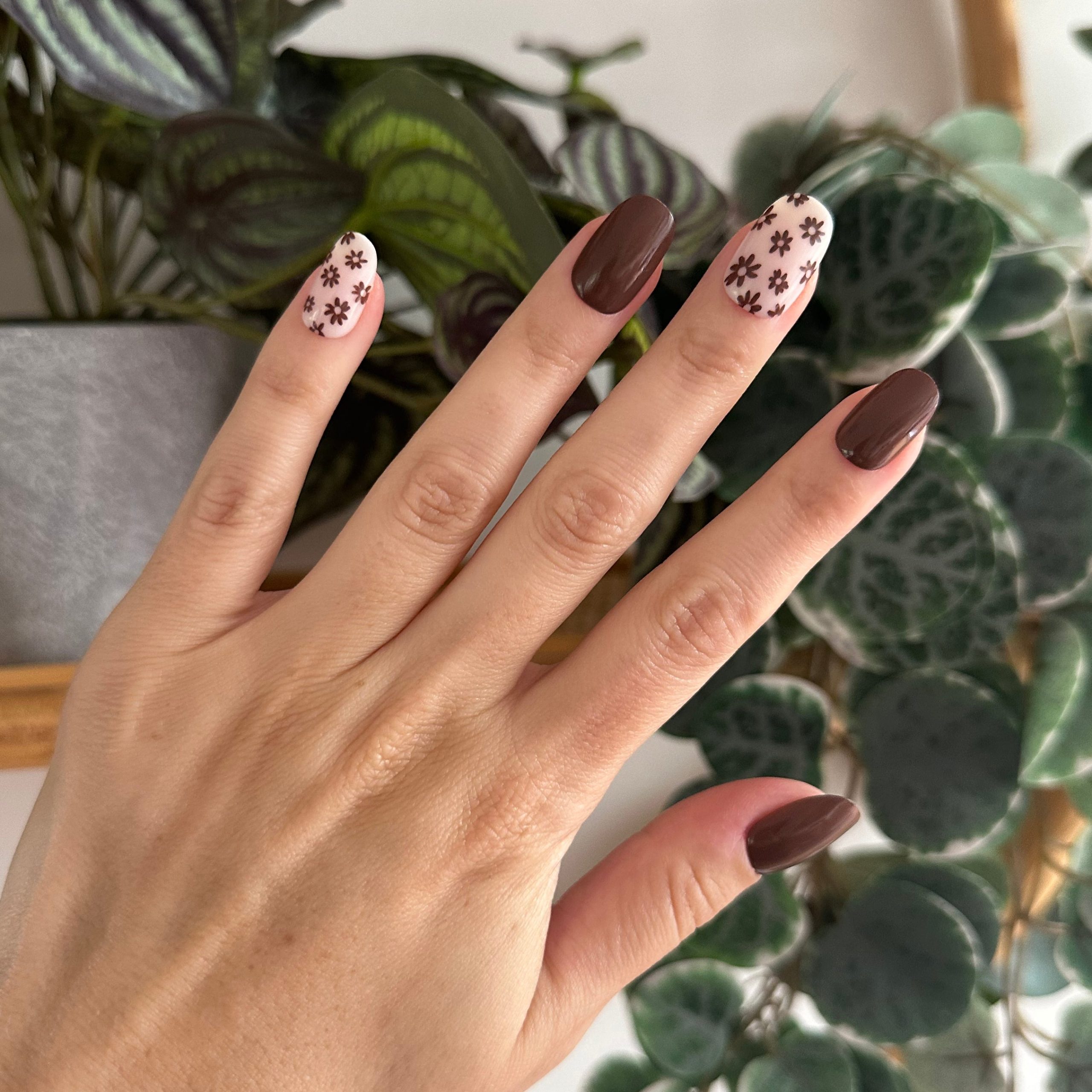 A mixed pack fall floral mani in a short round shape.