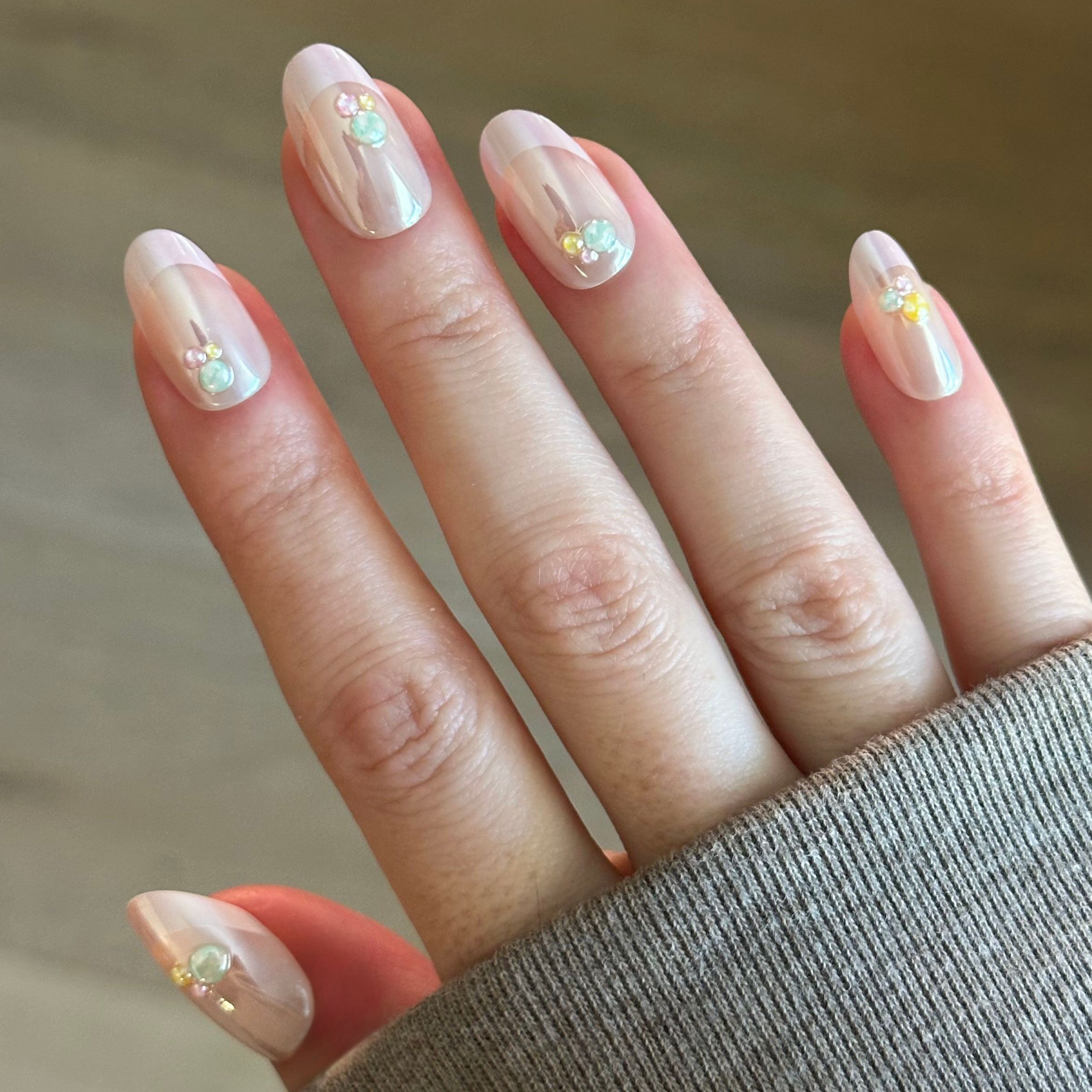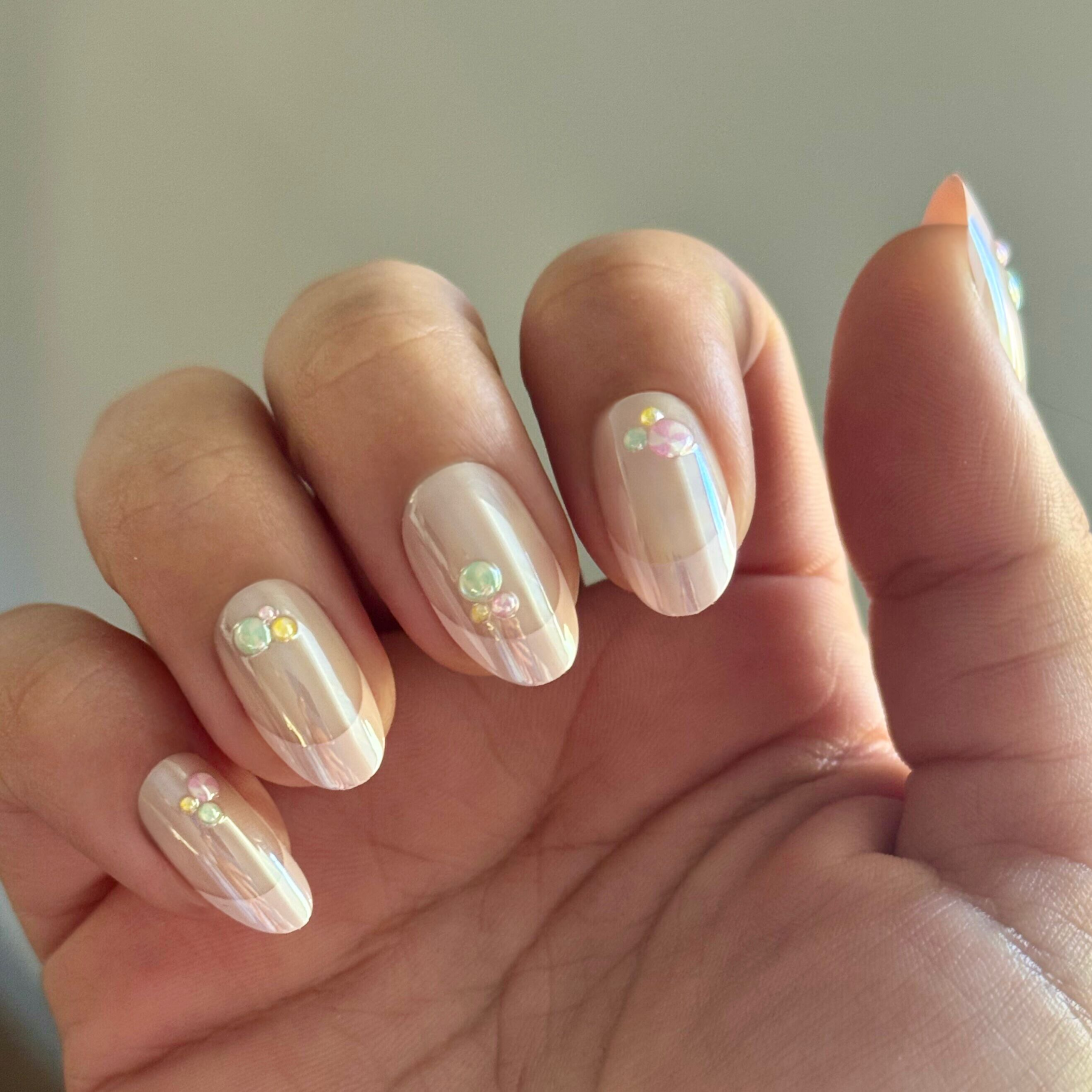 An iridescent pink French mani accented with 3D puffy candy gum drops. Sweet!