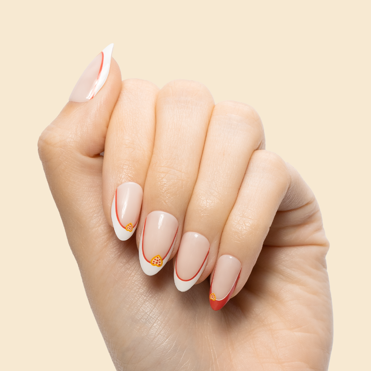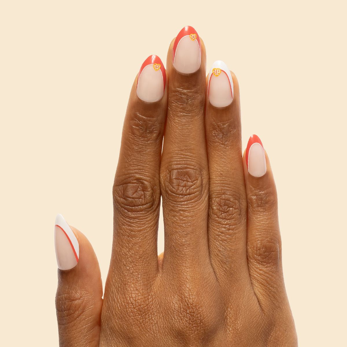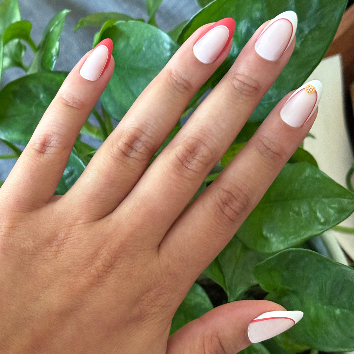 If you love pizza. then you’ll love this red French manicure accented with lovable heart shaped pizzas in a medium almond shape.