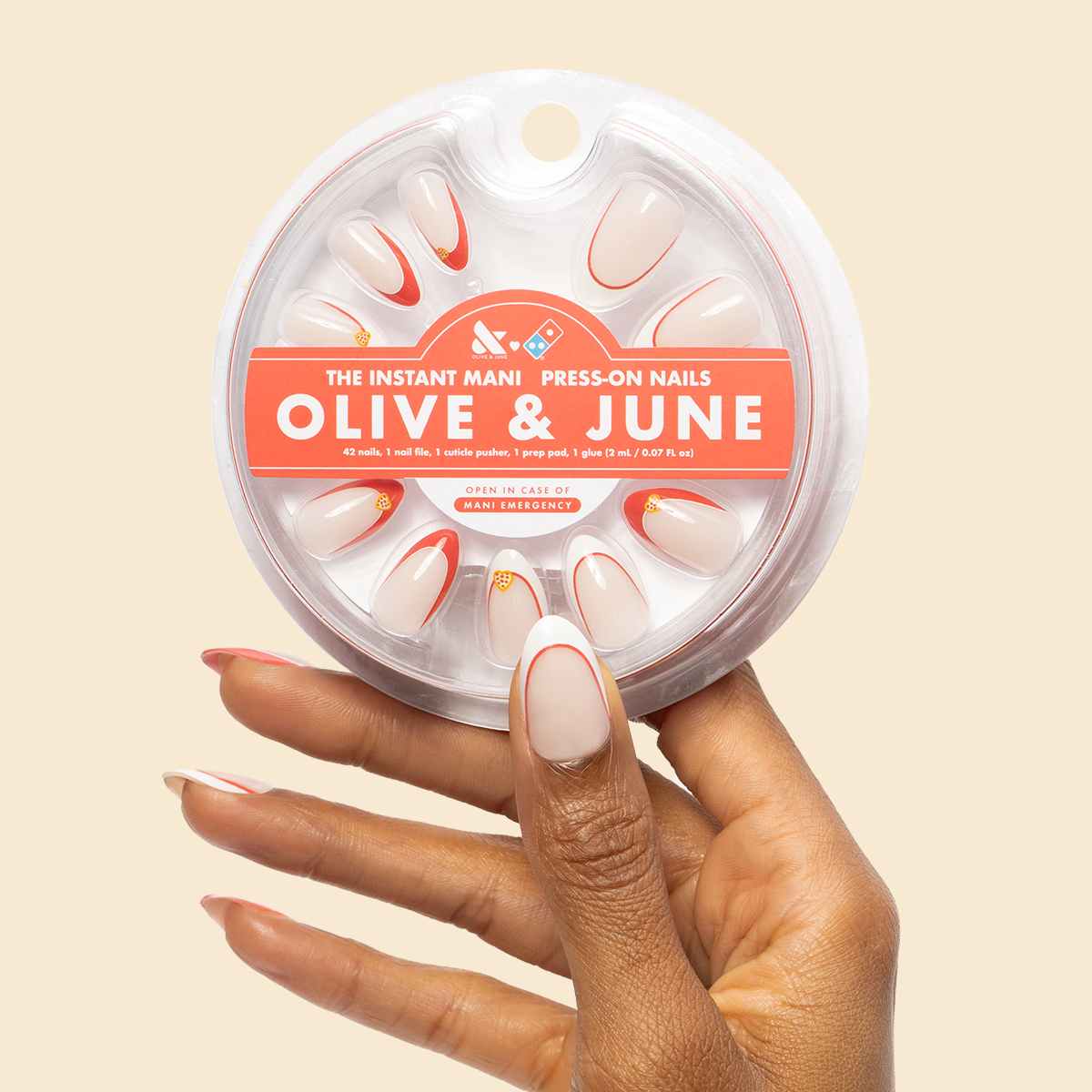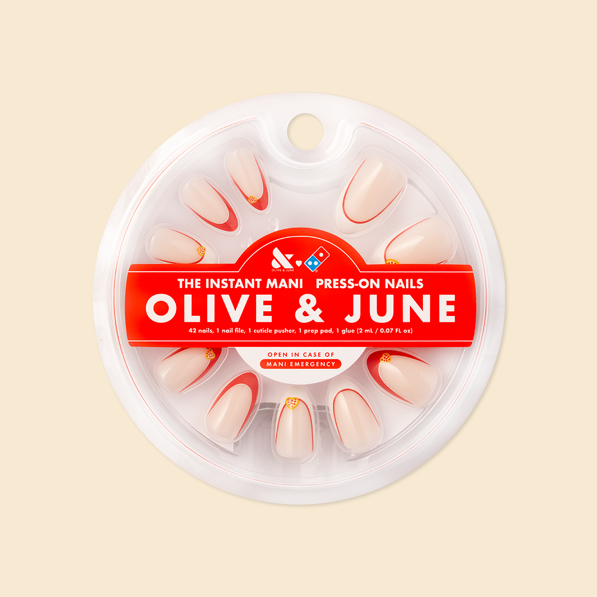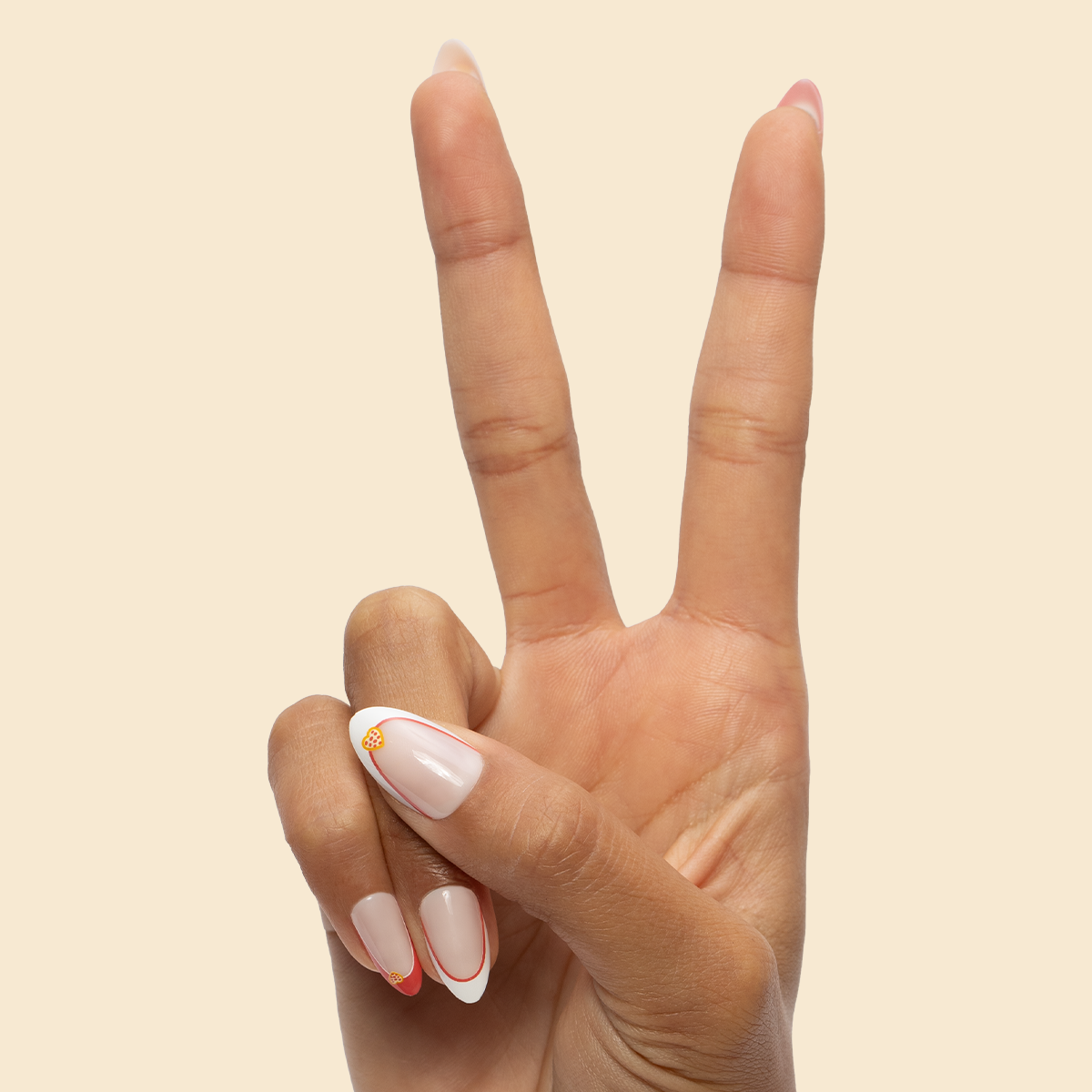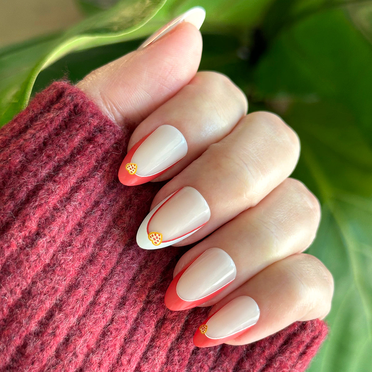 If you love pizza. then you’ll love this red French manicure accented with lovable heart shaped pizzas in a medium almond shape.