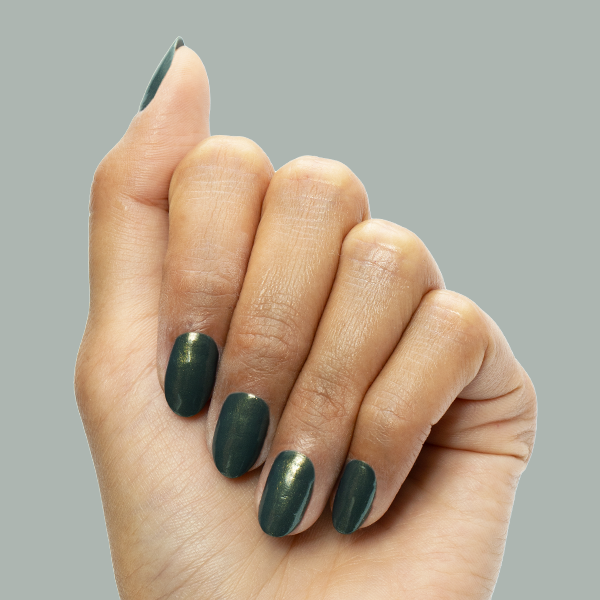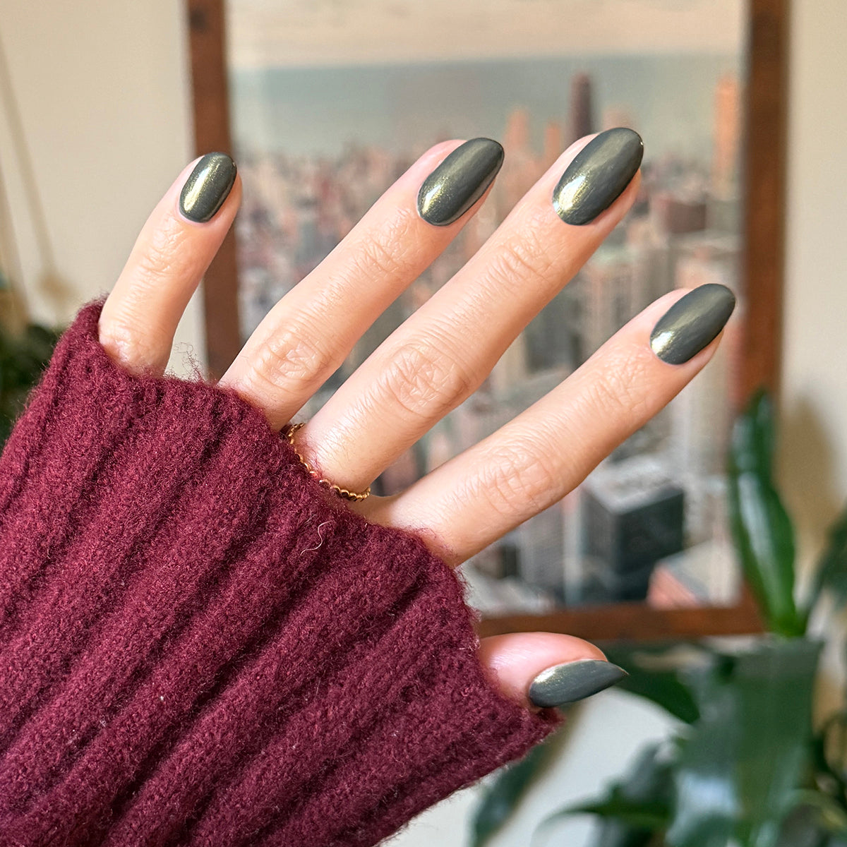 A deep olive green with a shimmery golden chrome finish. Always rolled — never shake your polish!
