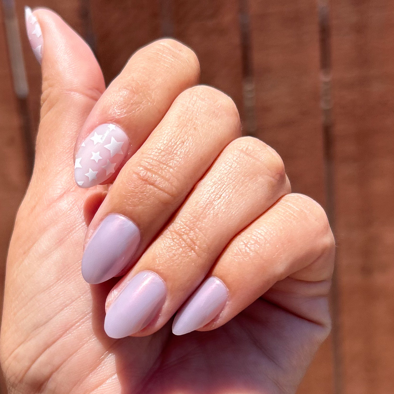 A mixed pack of iridescent purple nails and all-over stars for a magical mermaid mani in a medium almond shape.