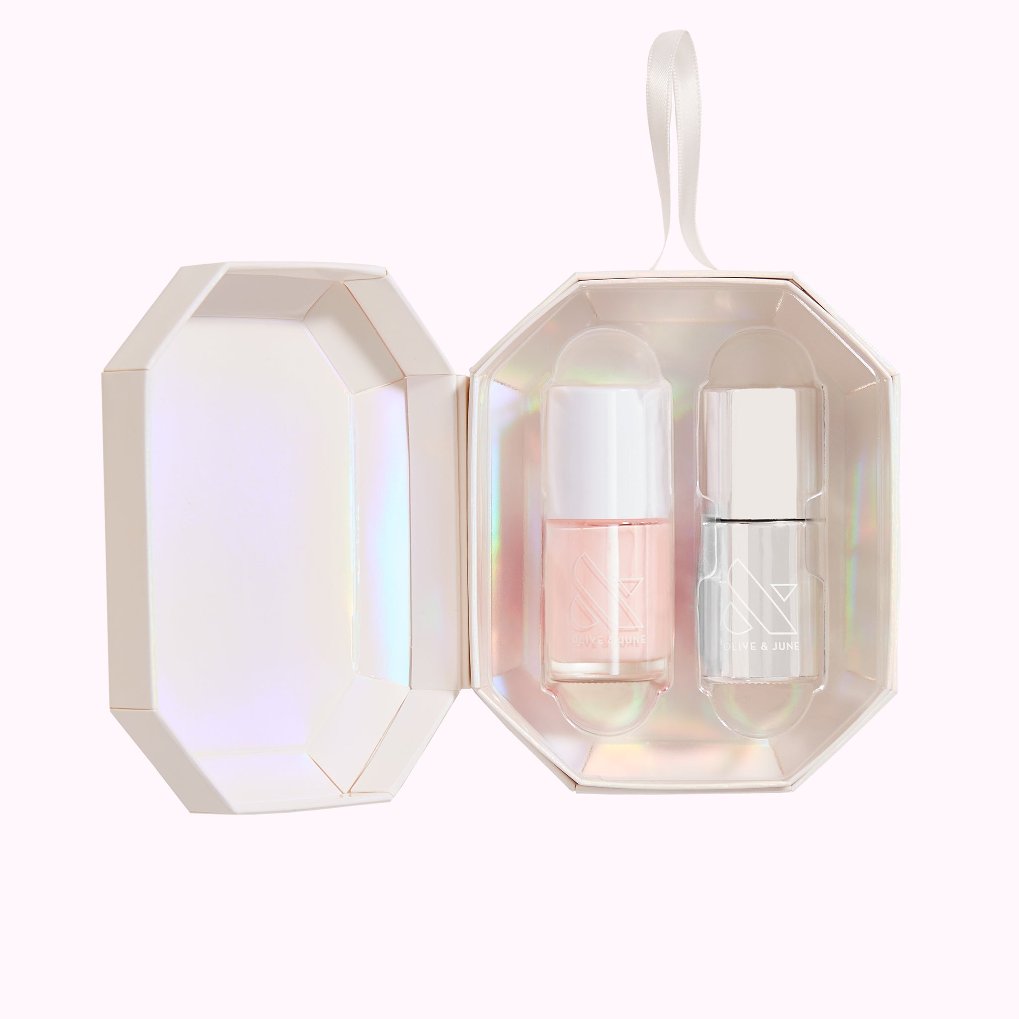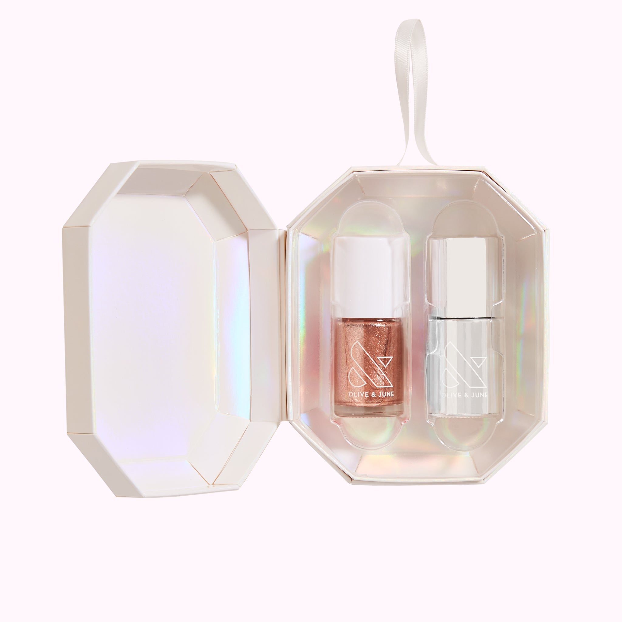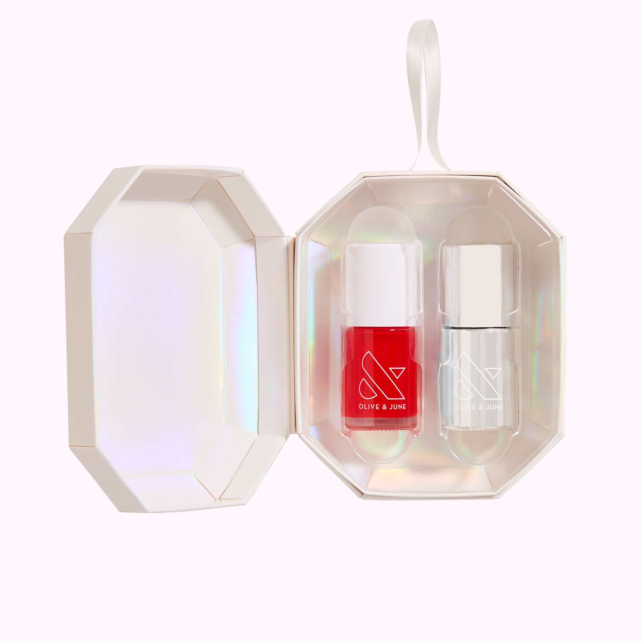 Give the perfect holiday mani without messing up your nails. Our limited edition holiday ornament bundles one Olive & June polish color with a bottle of our best-selling Super Glossy Top Coat to keep your mani shiny and protected all season long.