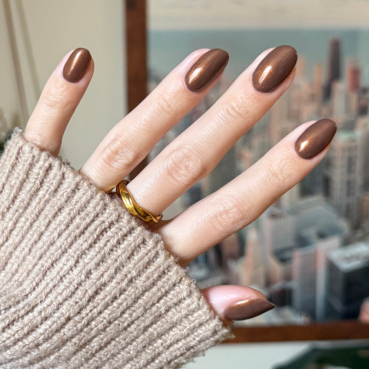 A milky brown with golden iridescence that makes even mani a chocoholic.