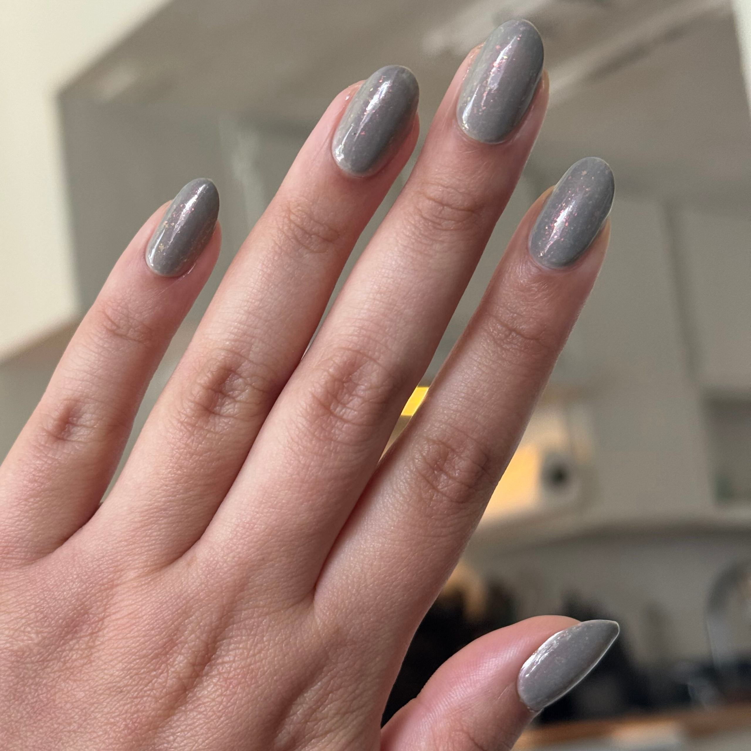 A milky sheer grey with holographic flakes that dazzles in every light.