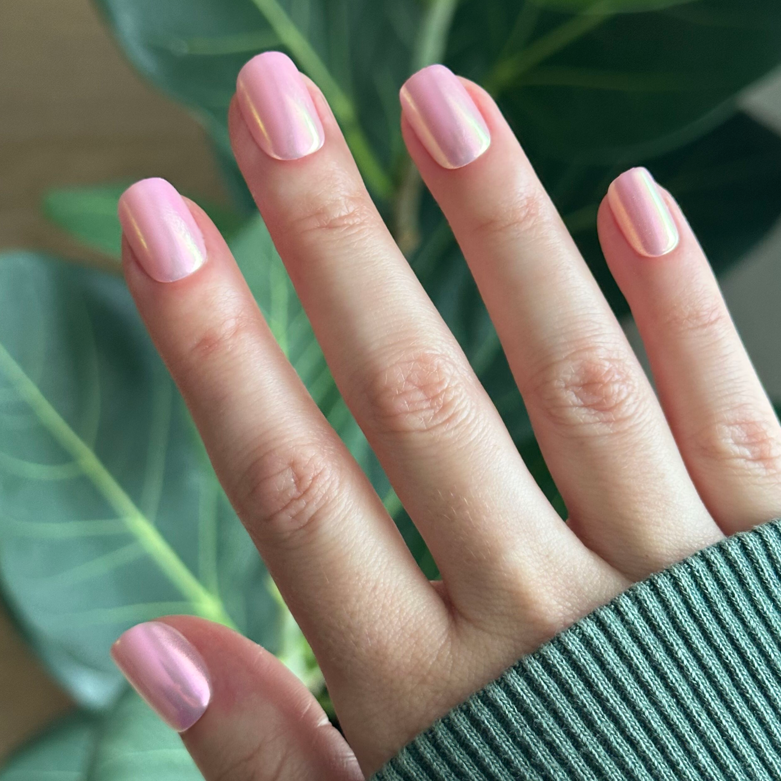 An iridescent pink rainbow chrome mani in an extra short squoval shape.