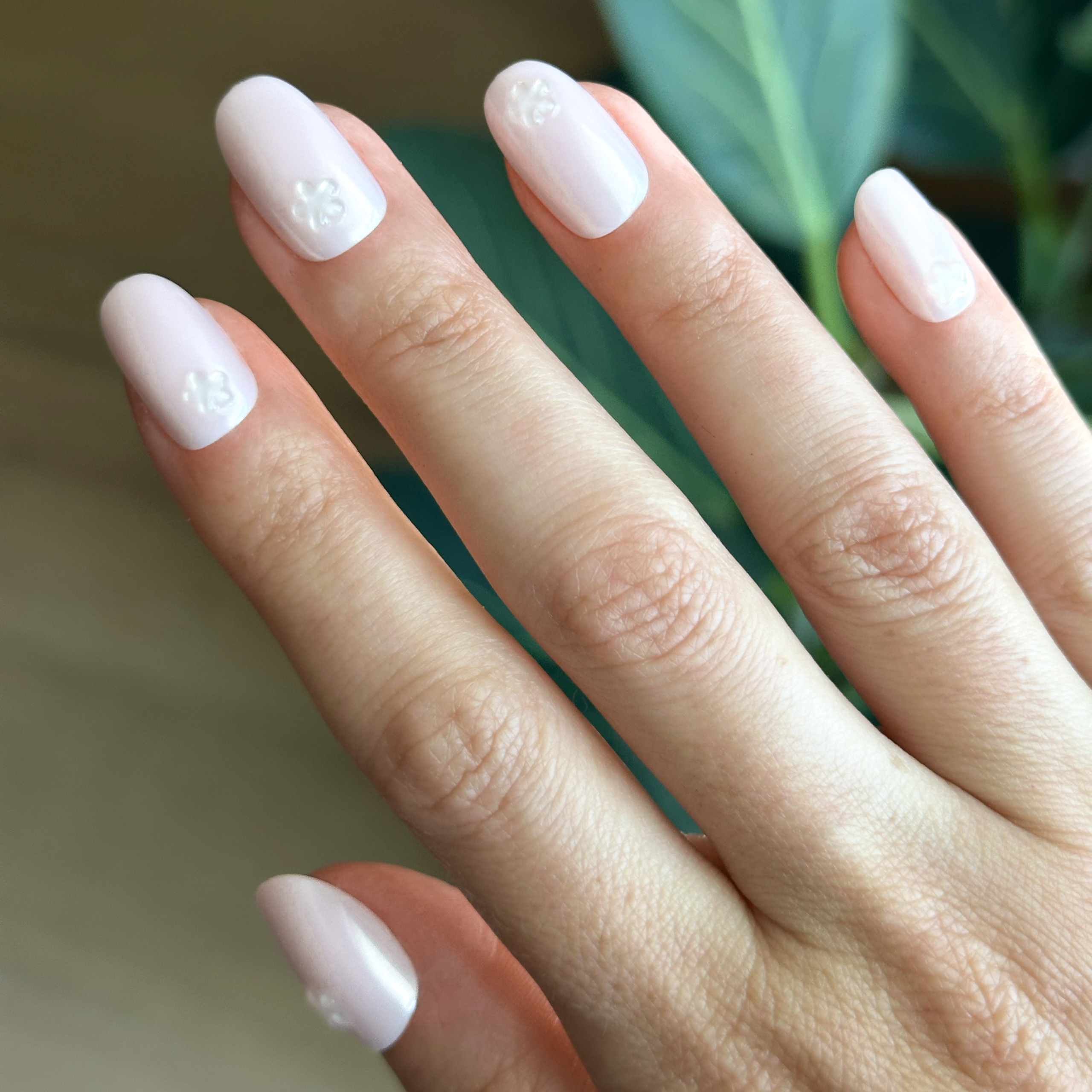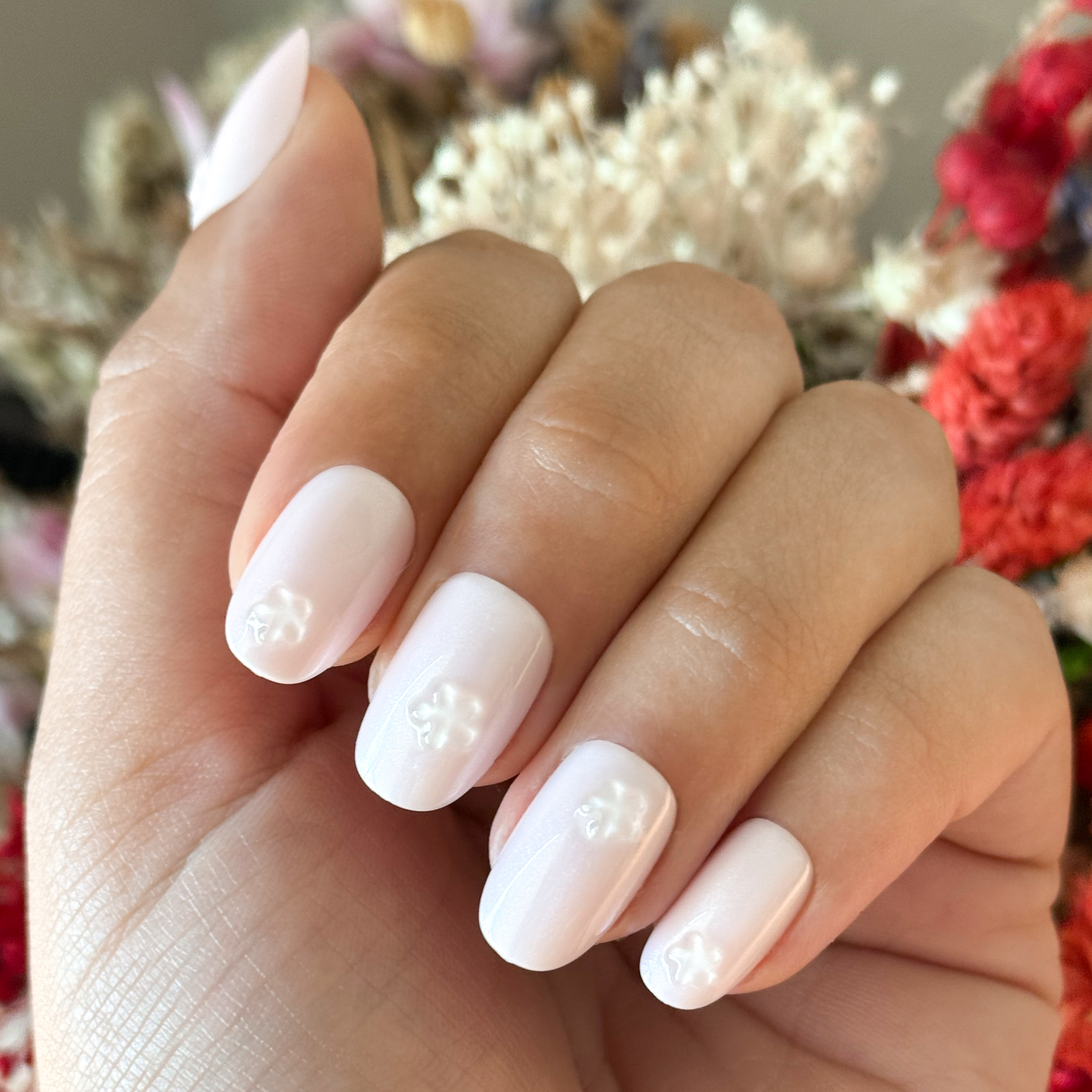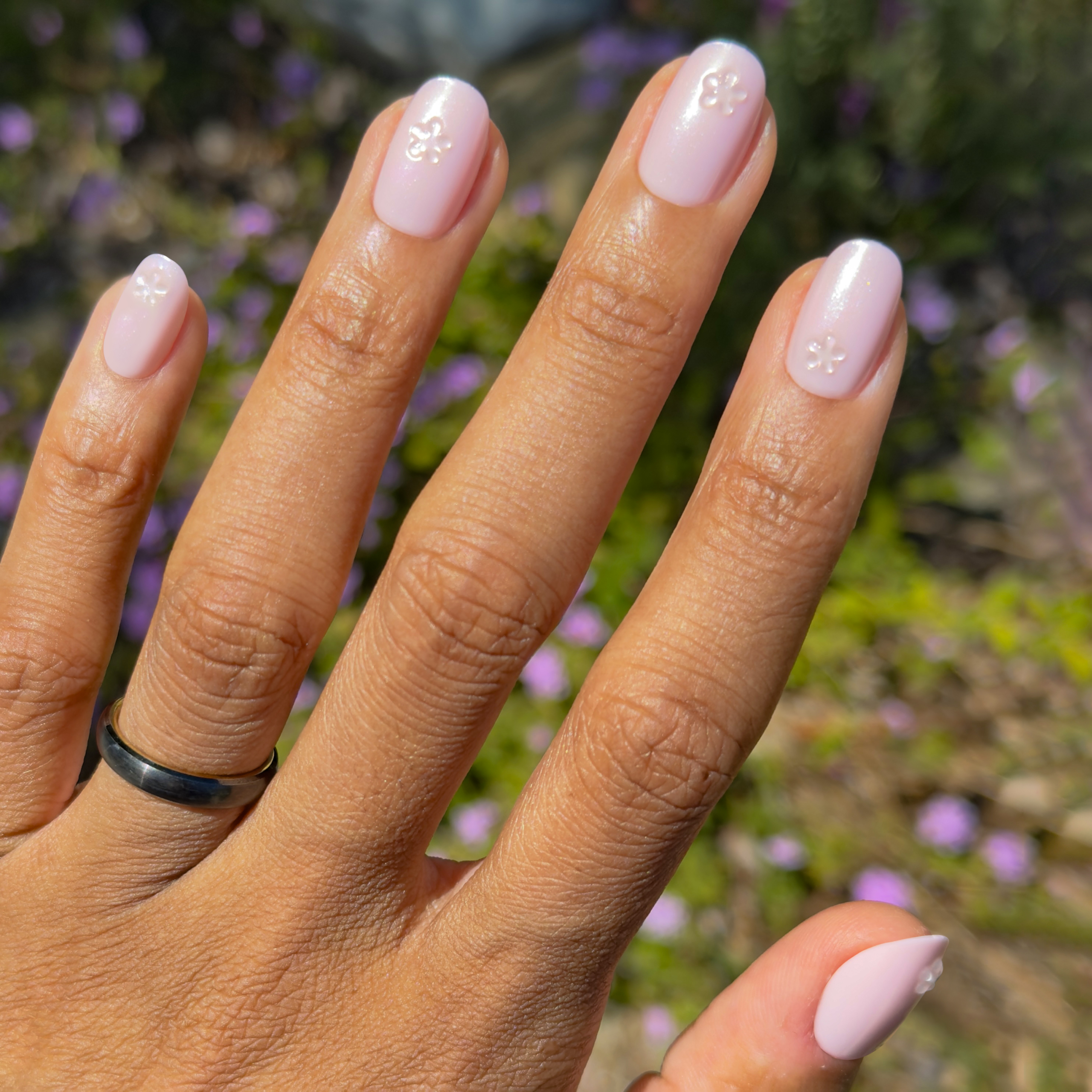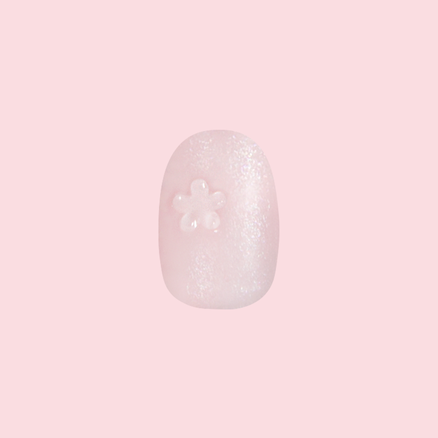 A shimmery metallic pink mani with 3D puffy translucent flowers in a short round shape.