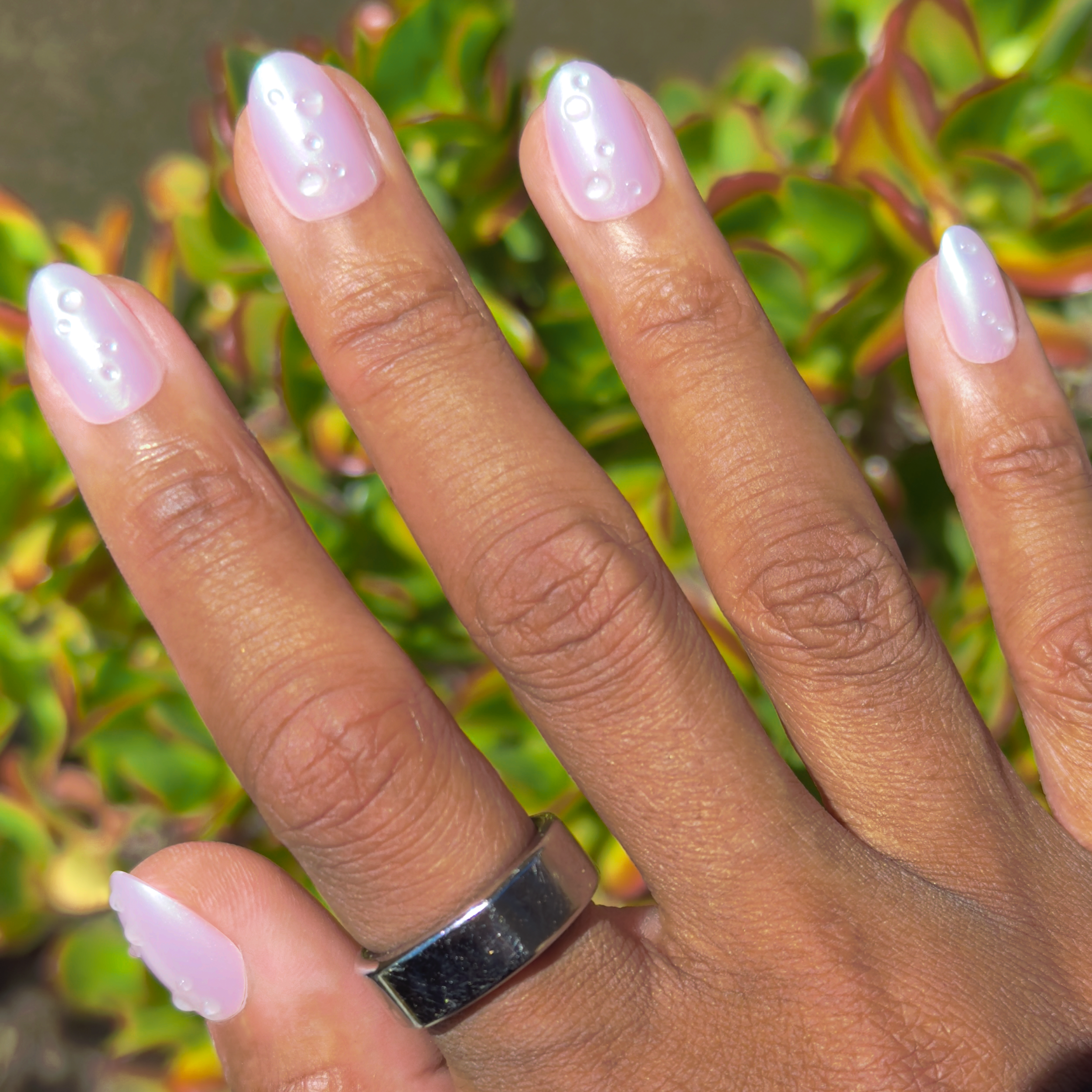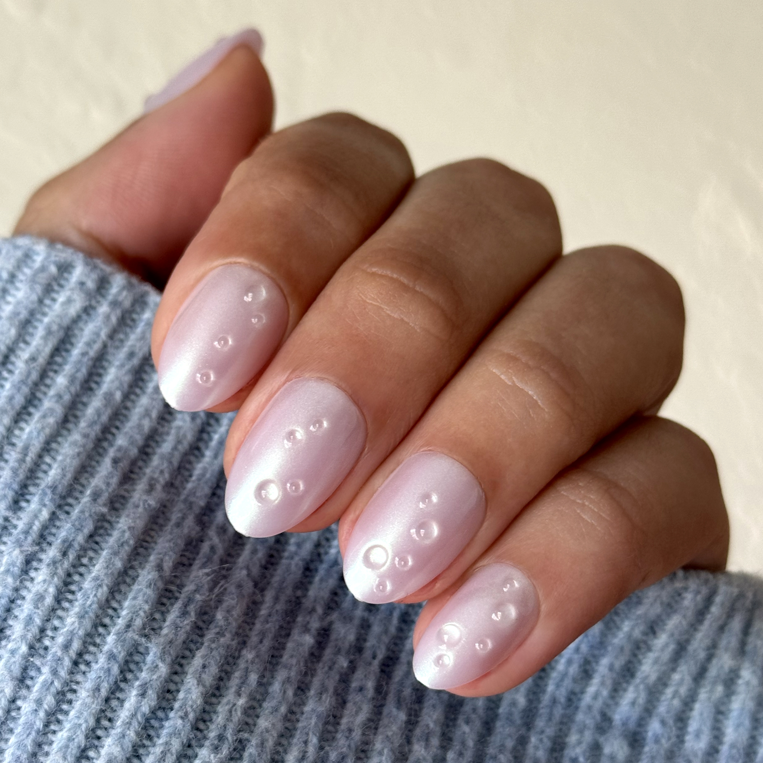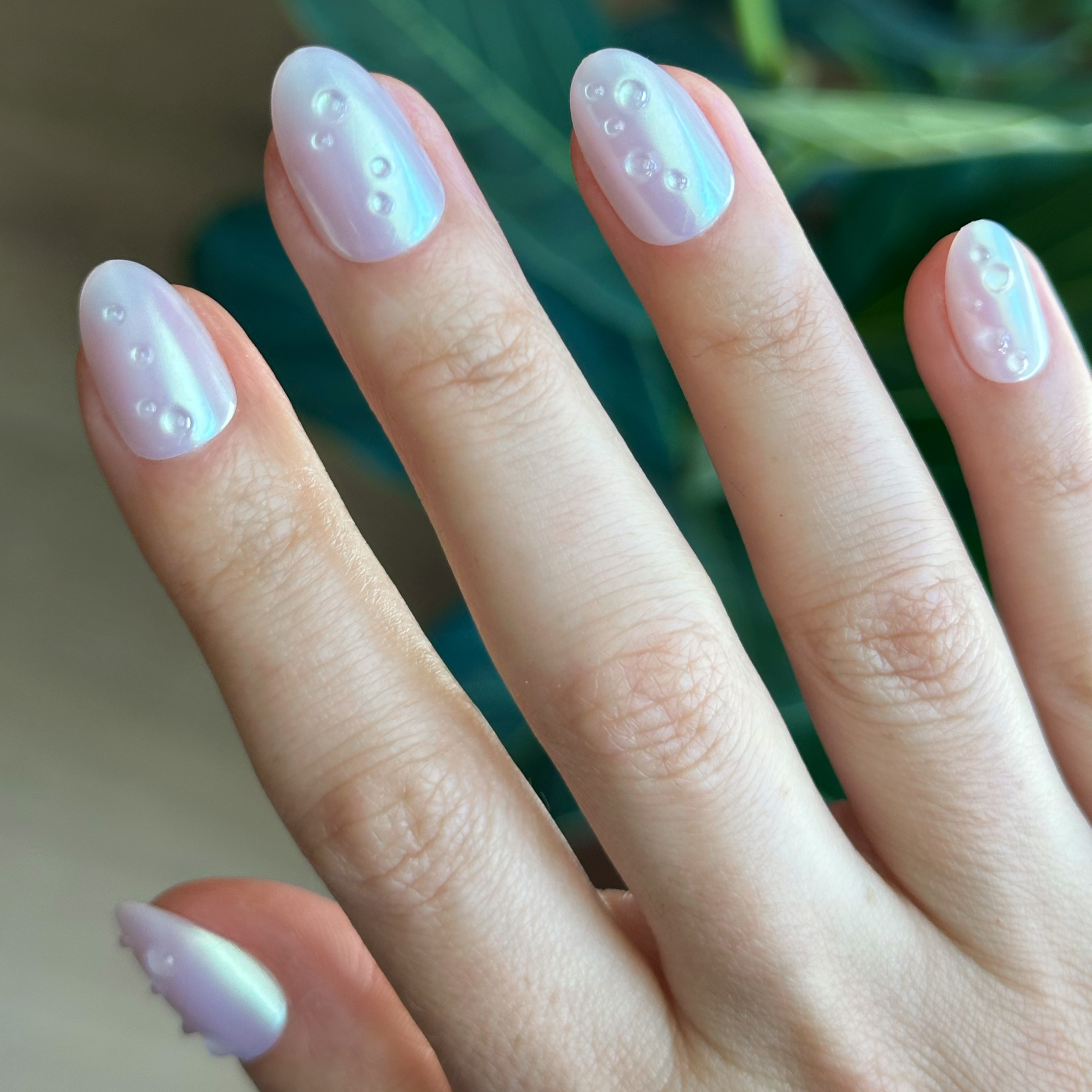 An iridescent lavender shimmer mani with puffy 3D raindrops in a short almond shape.