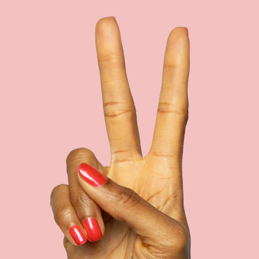 A bright pinky-red gel polish packed with silver shimmer that reigns supreme.