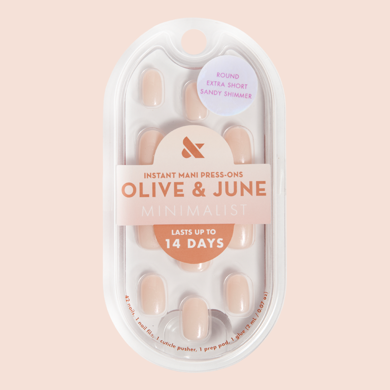 A shimmery neutral sandy beige mani in an extra short round shape.