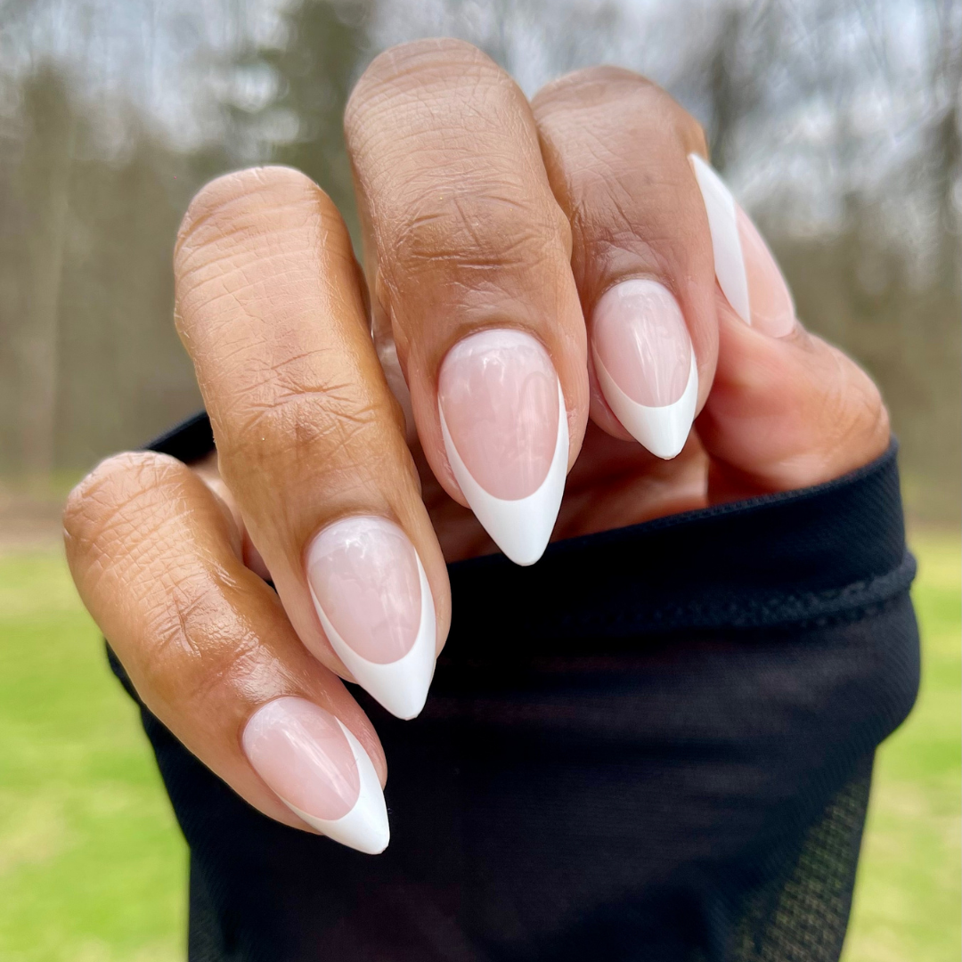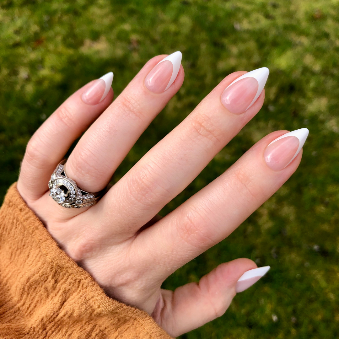 A pointy stiletto shaped manicure with a classic and precise french tip.