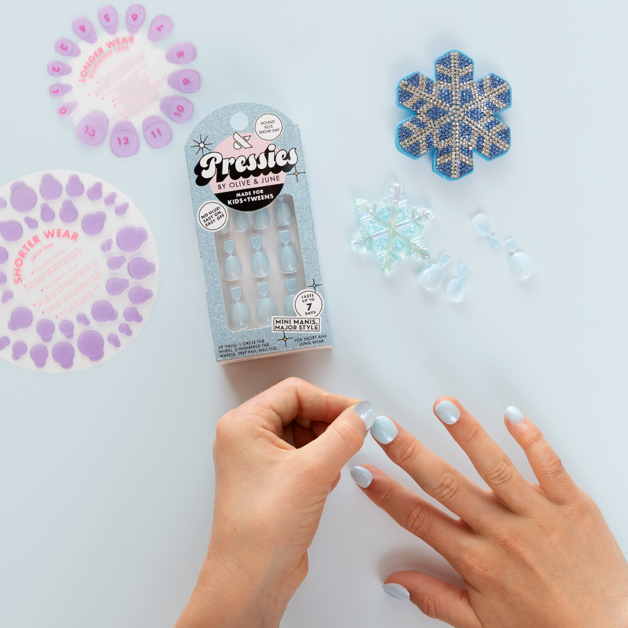 It’s a snow day. and we’re staying in with the chillest snowy mani. This bouncy blue pastel base got caught in a sparkly snowstorm. Brr!