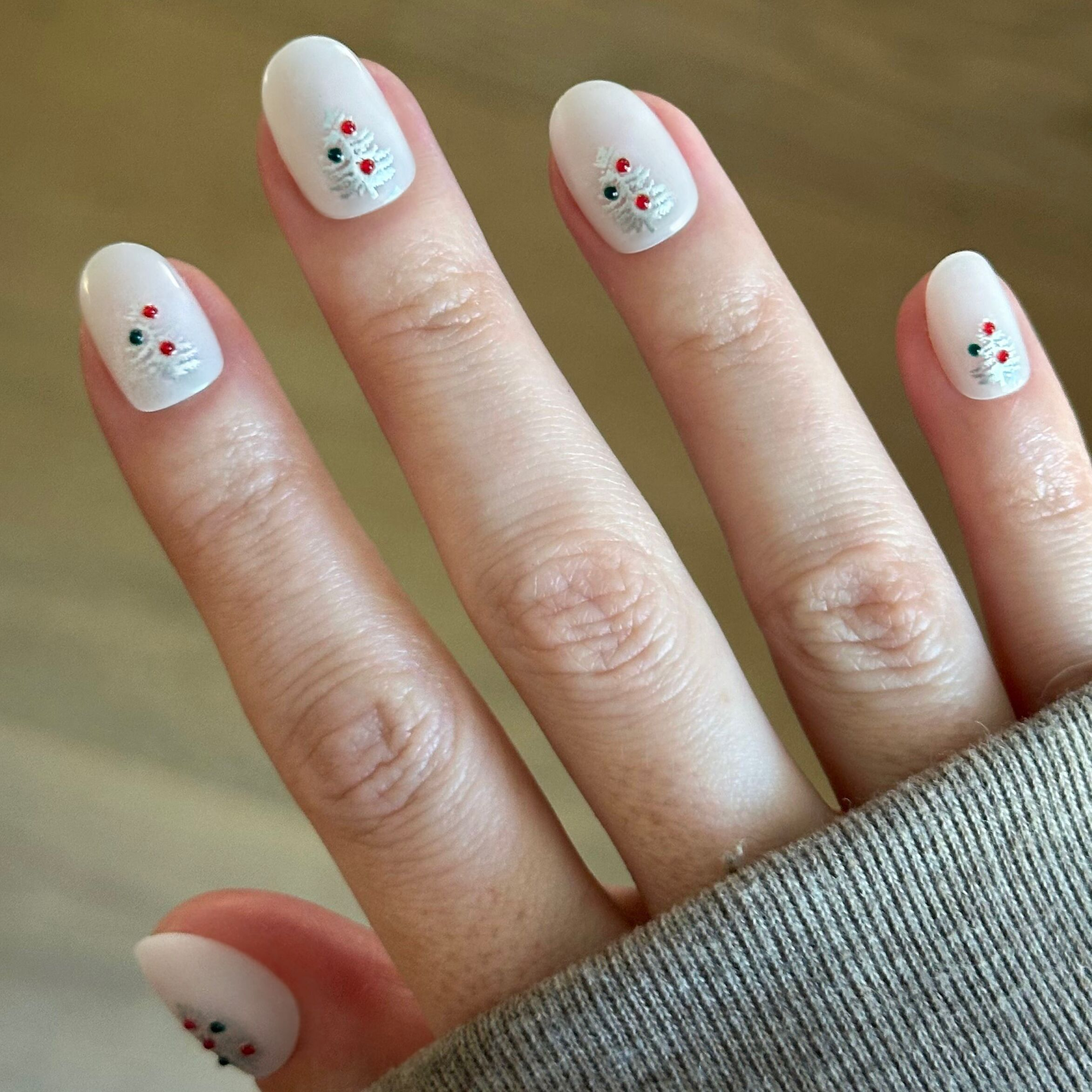 A milky white mani with silvery evergreen trees topped with 3D puffy red and green ornaments in an extra short round shape.