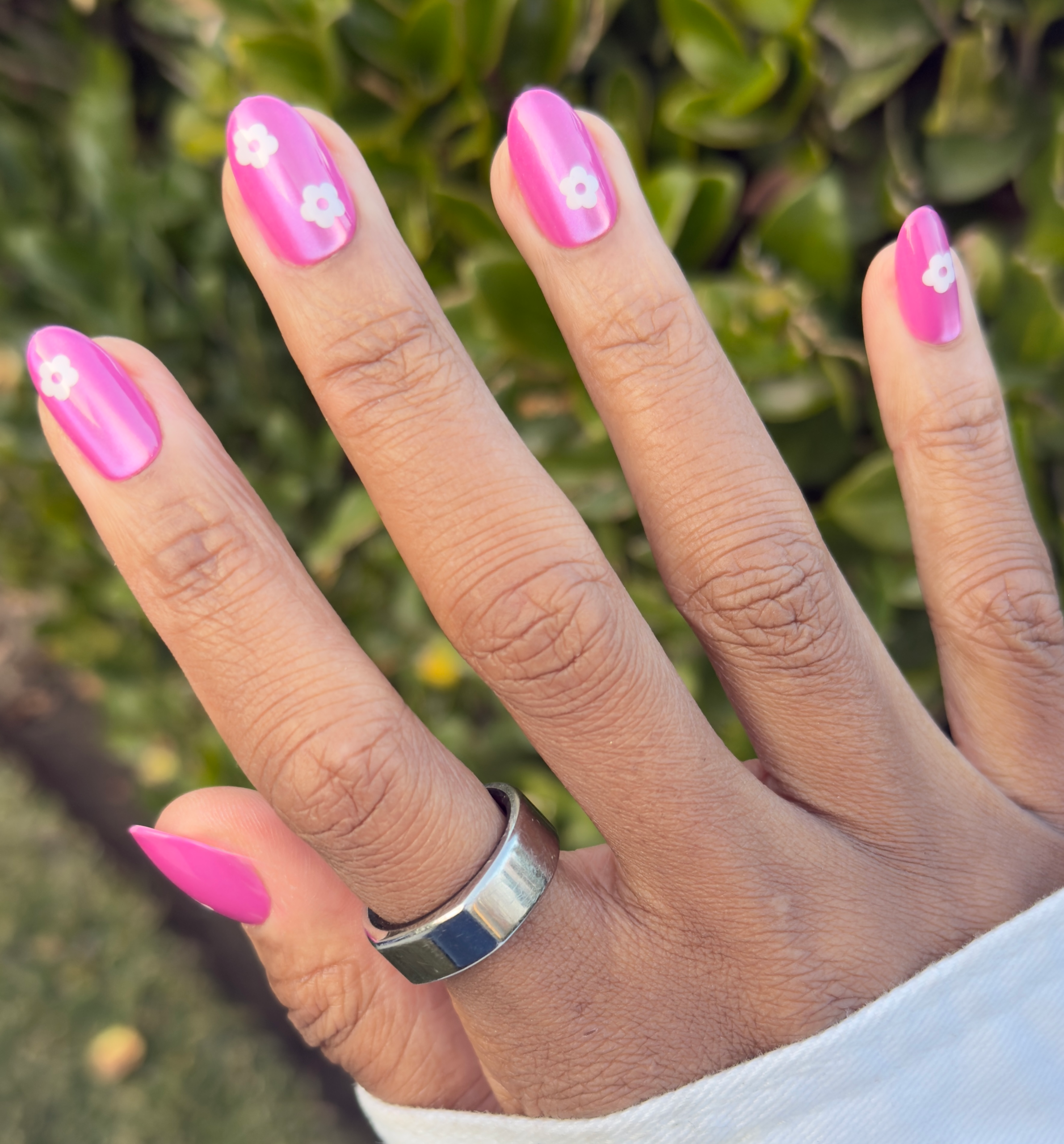 A glittery pink mani accented by big blooms in a medium oval shape.