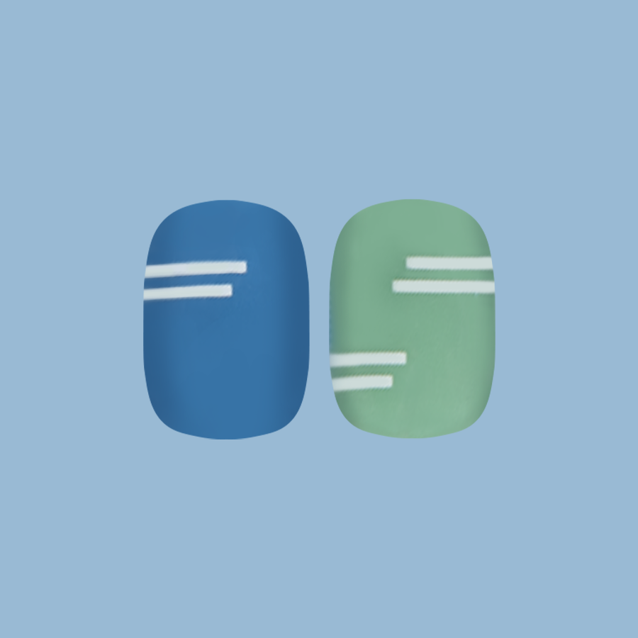 A mixed green and blue mani with sporty white stripes in an extra short squoval shape.