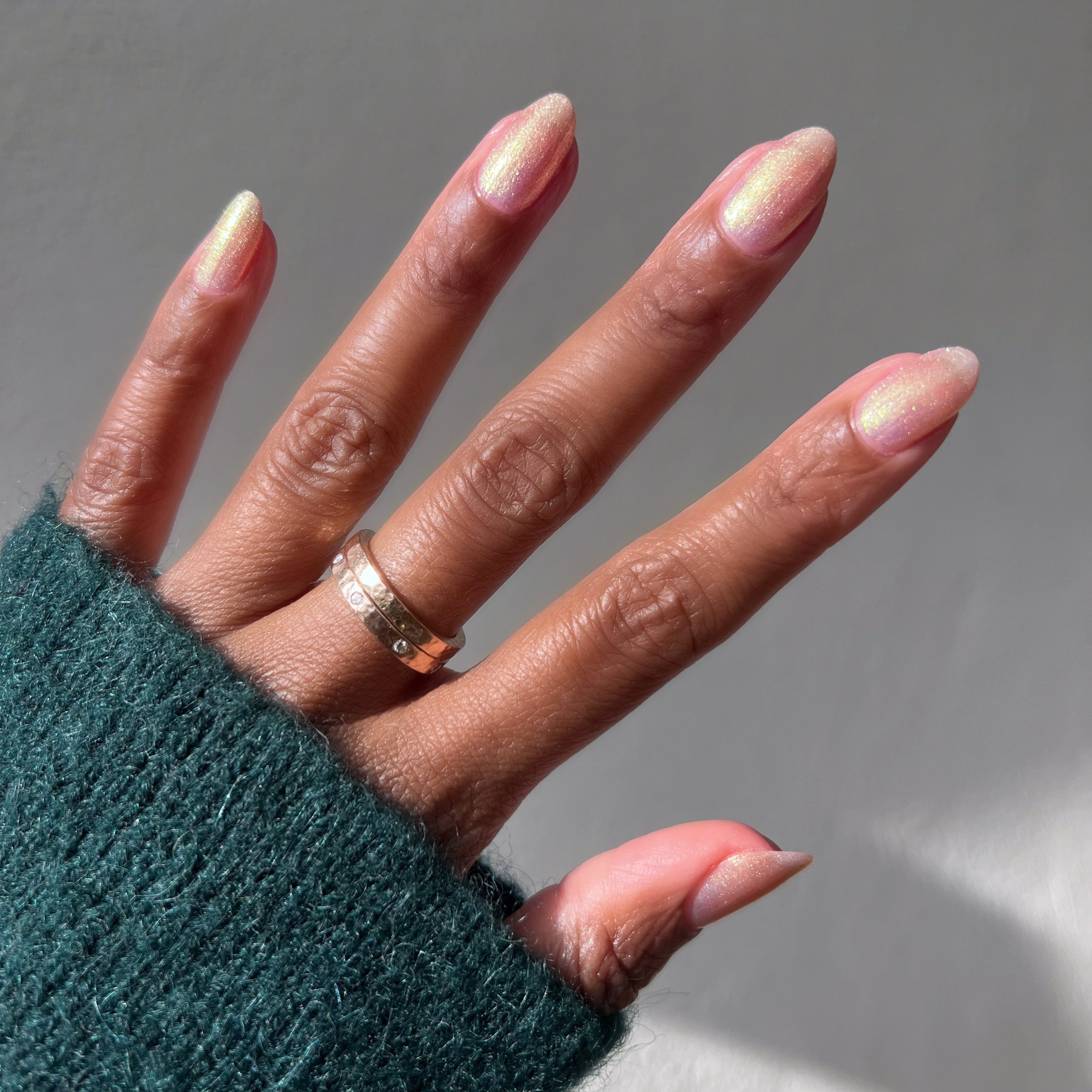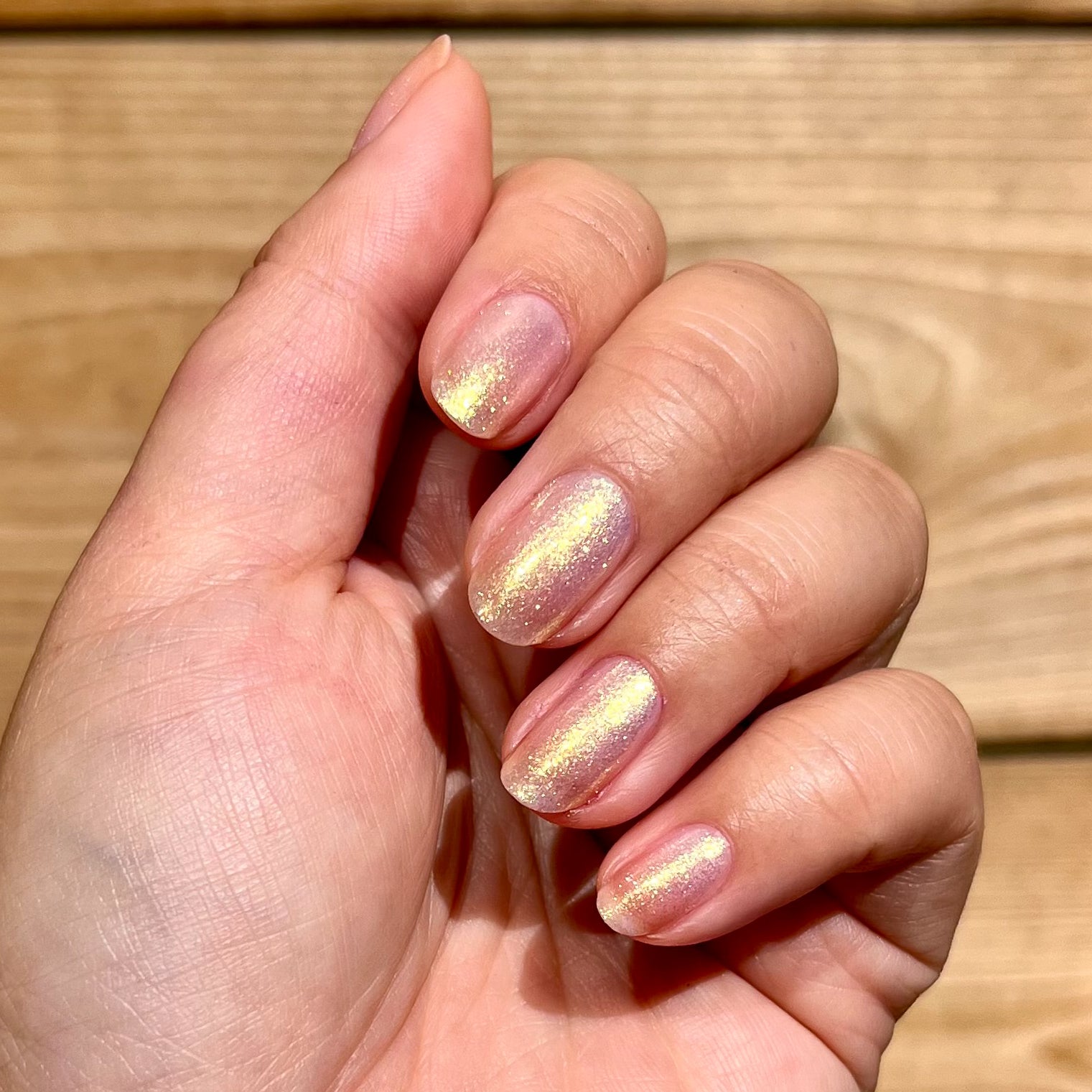 A sheer and shimmery pink iridescent polish that’s sweet on its own. but even sweeter as a topper.