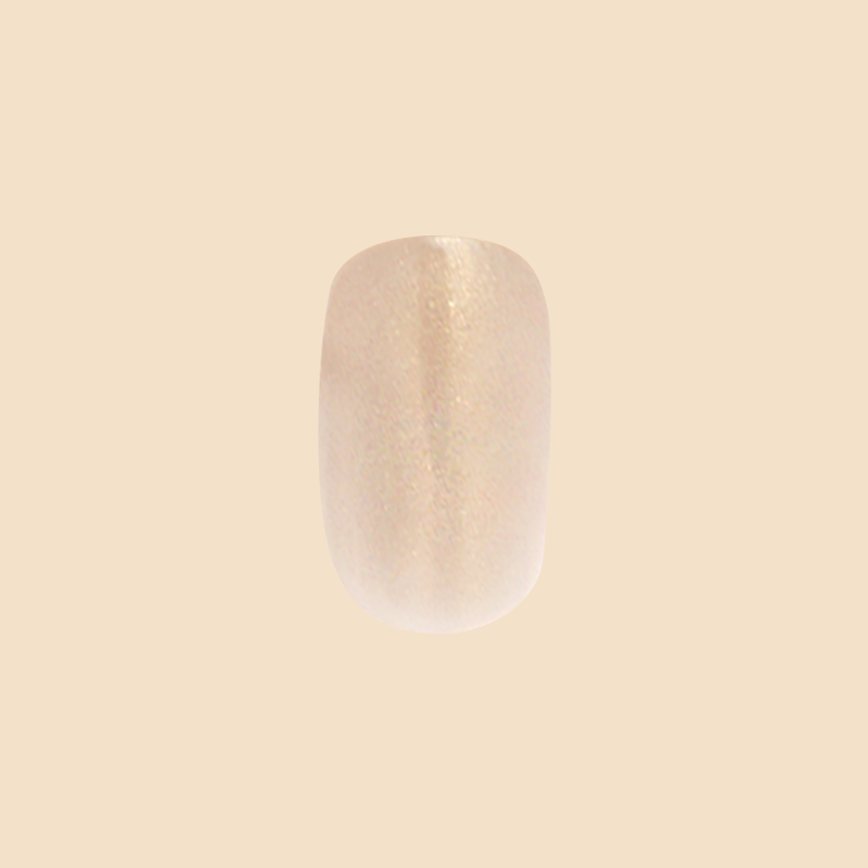 A semi-sheer gold glazed manicure in a short squoval shape.