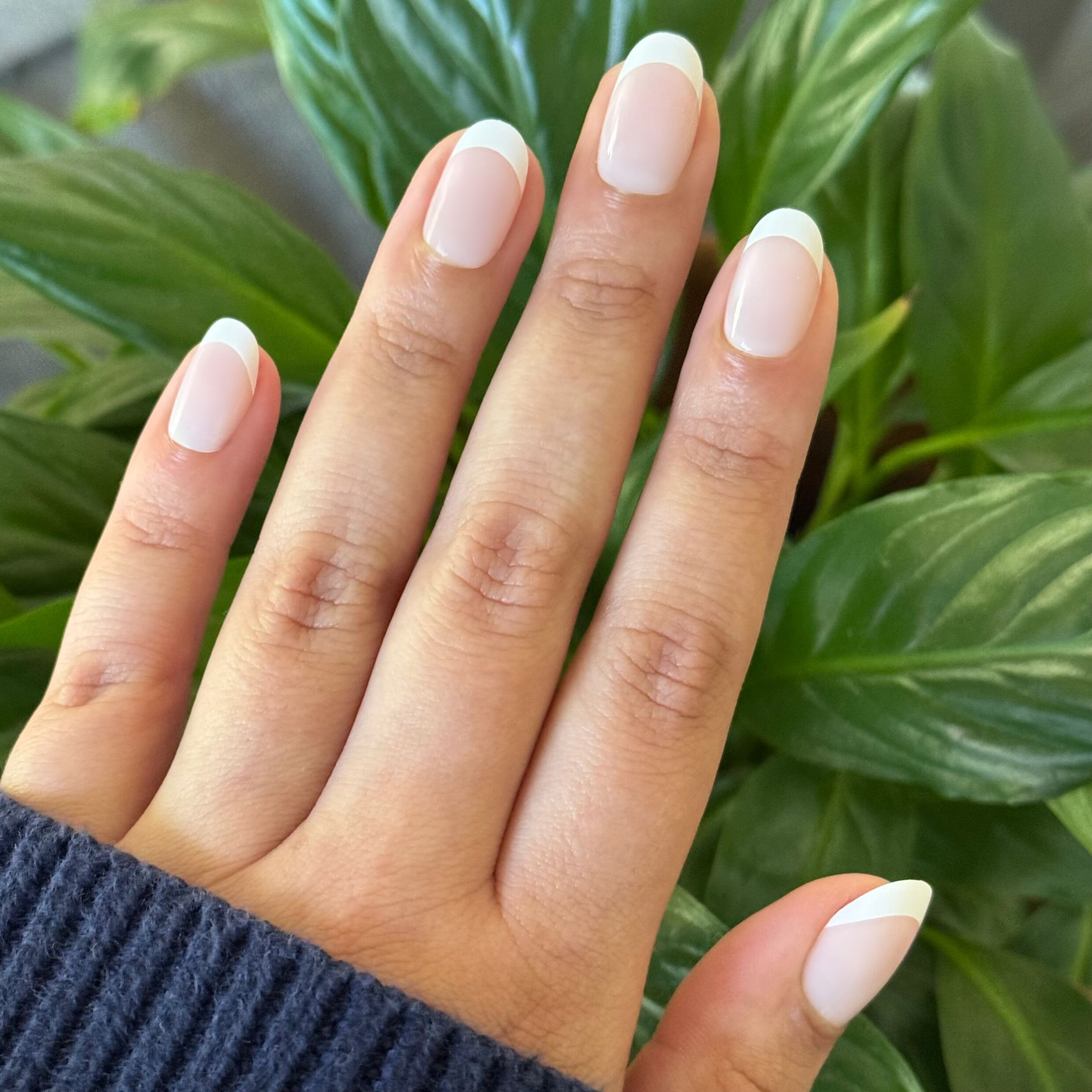 A sheer neutral base with a diffused milky white tip french mani in a short round shape.