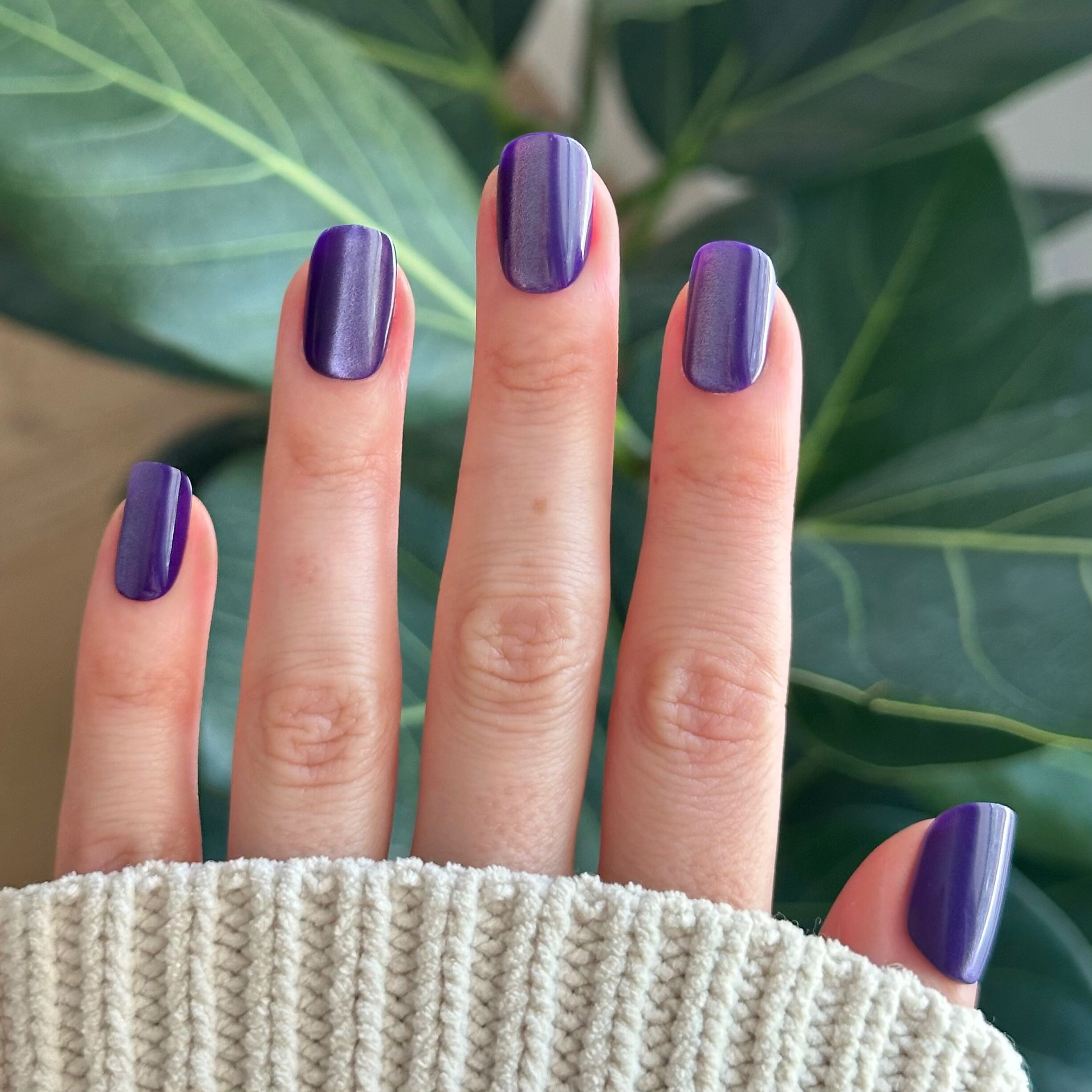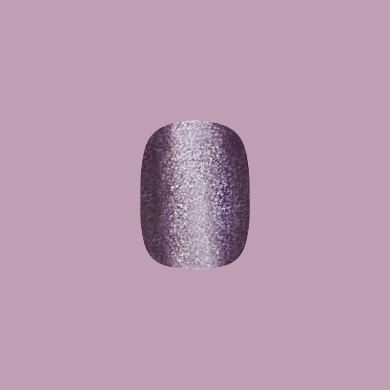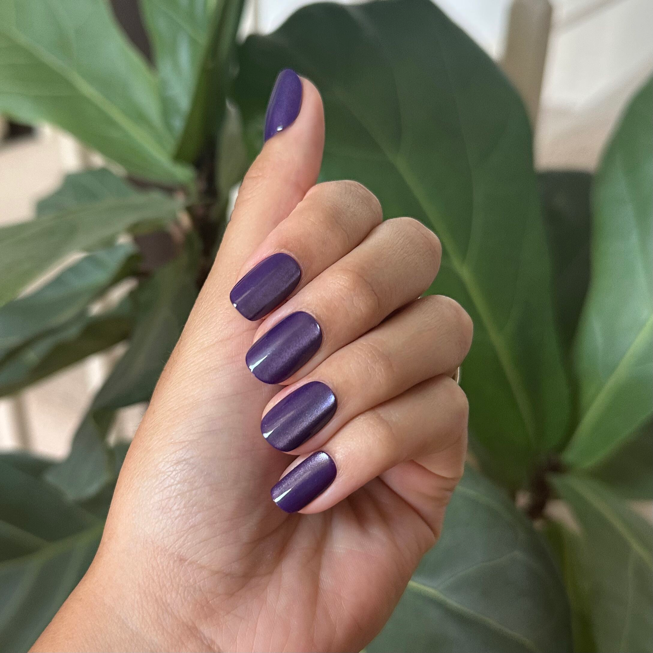 A dark purple topped with a velvet magnetic effect in a short squoval shape.