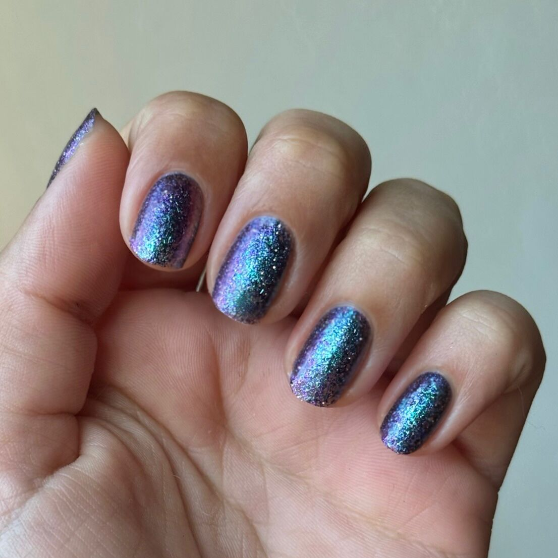 An iridescent glitter polish with a purple-blue shift that is not a want. but a need.